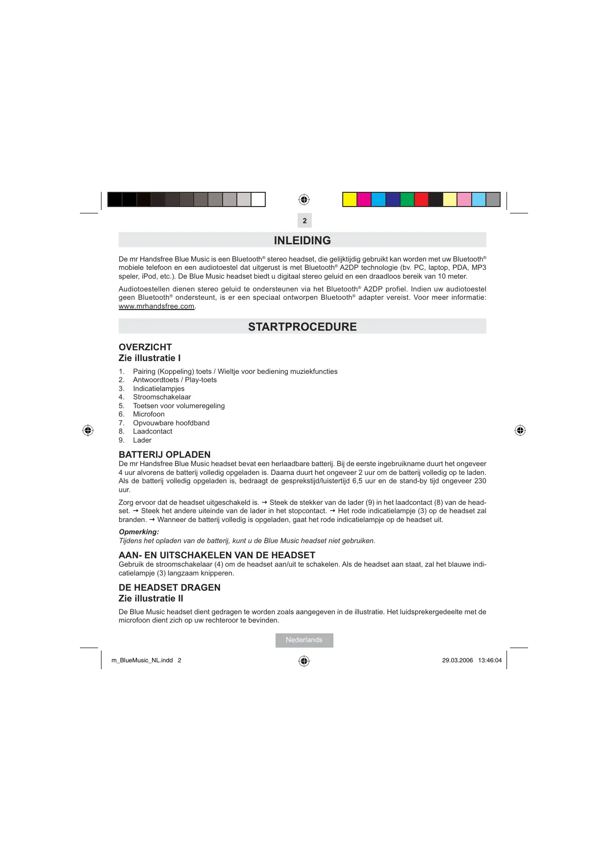 INLEIDING De mr Handsfree Blue Music is een Bluetooth® stereo headset, die gelijktijdig gebruikt kan worden met uw Bluetooth® mobiele telefoon en een audiotoestel dat uitgerust is met Bluetooth® A2DP technologie (bv. PC, laptop, PDA, MP3 speler, iPod, etc.). De Blue Music headset biedt u digitaal stereo geluid en een draadloos bereik van 10 meter. Audiotoestellen dienen stereo geluid te ondersteunen via het Bluetooth® A2DP profiel. Indien uw audiotoestel geen Bluetooth® ondersteunt, is er een speciaal ontworpen Bluetooth® adapter vereist. Voor meer informatie: www.mrhandsfree.com. STARTPROCEDURE OVERZICHT Zie illustratie I
