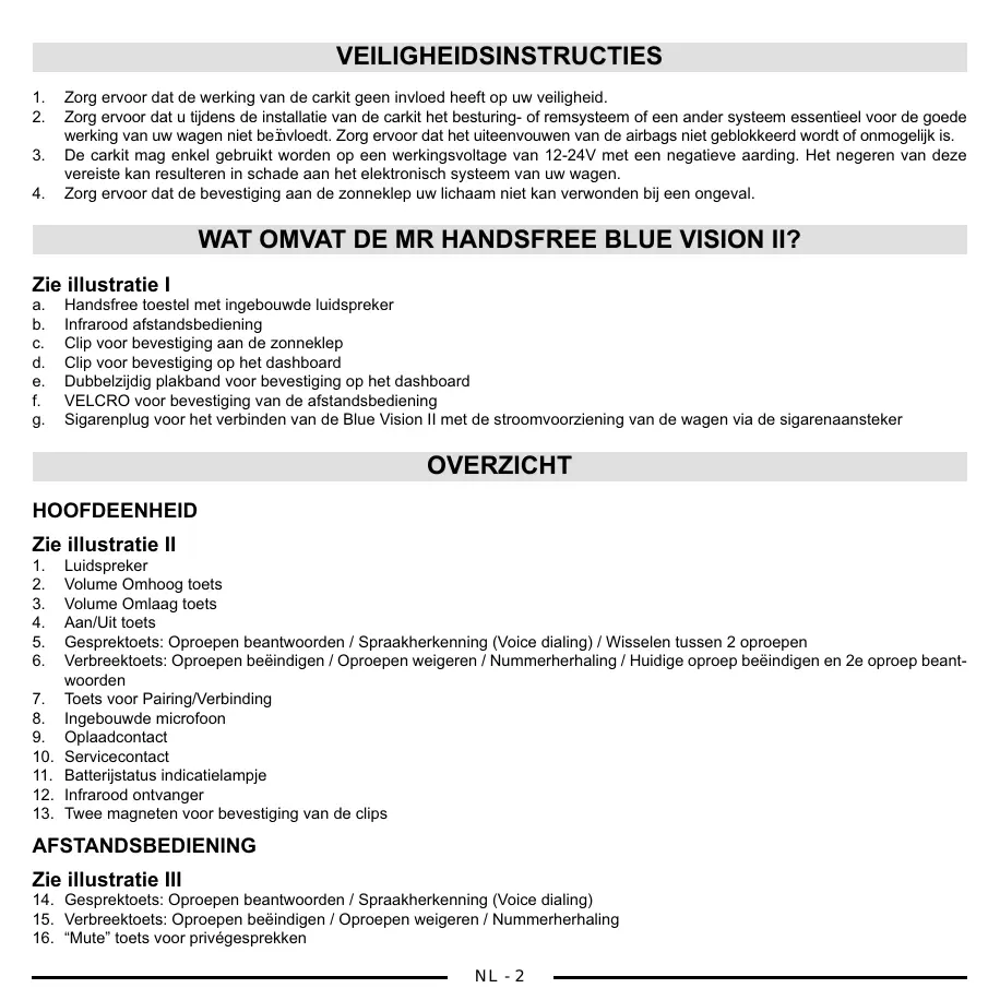 Zorg ervoor dat de werking van de carkit geen invloed heeft op uw veiligheid. Zorg ervoor dat u tijdens de installatie van de carkit het besturing- of remsysteem of een ander systeem essentieel voor de goede werking van uw wagen niet beïnvloedt. Zorg ervoor dat het uiteenvouwen van de airbags niet geblokkeerd wordt of onmogelijk is. De carkit mag enkel gebruikt worden op een werkingsvoltage van 12-24V met een negatieve aarding. Het negeren van deze vereiste kan resulteren in schade aan het elektronisch systeem van uw wagen. Zorg ervoor dat de bevestiging aan de zonneklep uw lichaam niet kan verwonden bij een ongeval. WAT OMVAT DE MR HANDSFREE BLUE VISION II? Zie illustratie I