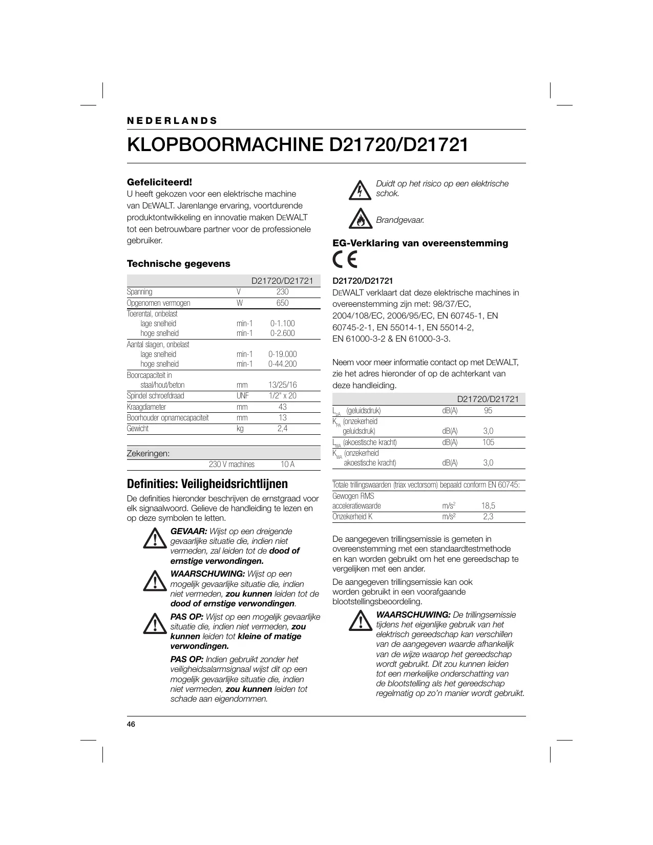 - Lees deze handleiding rustig en zorgvuldig door voordat u met de machine gaat werken. Beschrijving (fig. A) Uw DEWALT-machine is dubbel geïsoleerd overeenkomstig 60745; een aarddraad is dan ook niet nodig. Vervangen van het snoer of de stekker Als de stekker of het snoer wordt vervangen, moet de oude stekker c.q. het oude snoer worden weggegooid. Het is gevaarlijk om de stekker van een los snoer in het stopcontact te steken. Gebruik van verlengsnoeren BEOOGD GEBRUIK Wanneer een verlengsnoer wordt gebruikt, neem dan een goedgekeurd verlengsnoer, dat geschikt is voor het vermogen van de machine (zie technische gegevens). De aders moeten minimaal een doorsnede hebben van 1,5 mm2. Wanneer het verlengsnoer op een haspel zit, rol het snoer dan helemaal af. Uw slagboormachine is ontworpen voor professioneel boren en om schroeven in- en uit te draaien. Monteren en instellen WAARSCHUWING: Verander nooit het elektrische gereedschap of enig onderdeel daarvan. Dit kan leiden tot schade of lichamelijke verwondingen. NIET gebruiken in vochtige omstandigheden of in de nabijheid van brandbare vloeistoffen of gassen. Deze slagboormachines zijn professionele elektrische gereedschappen. HOUD het werktuig uit de buurt van kinderen. Toezicht is vereist wanneer dit gereedschap wordt gebruikt door onervaren personen.