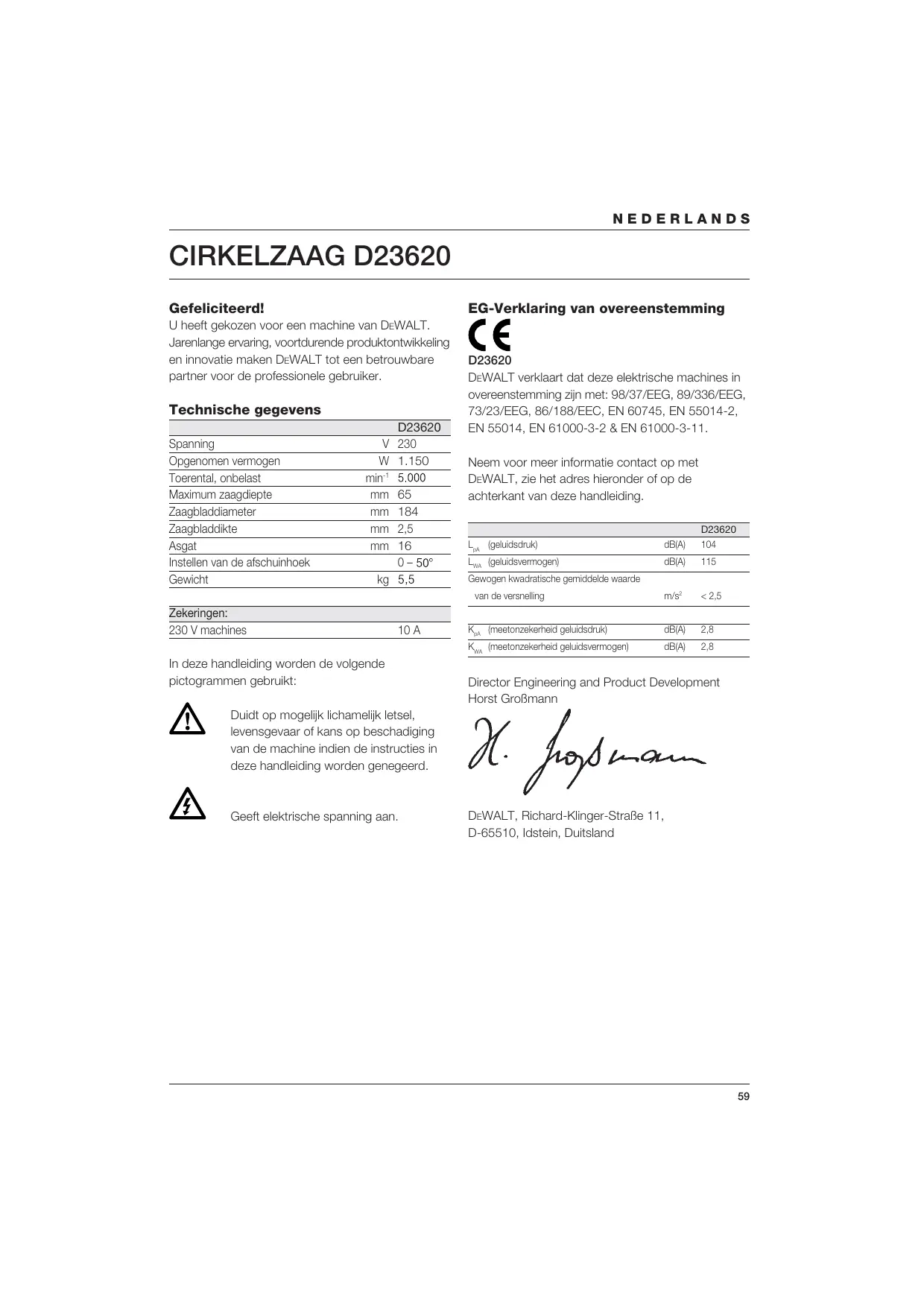 m/s2 < 2,5 Gewogen kwadratische gemiddelde waarde van de versnelling Zekeringen: 230 V machines 10 A In deze handleiding worden de volgende pictogrammen gebruikt: KpA (meetonzekerheid geluidsdruk) dB(A) 2,8 KWA (meetonzekerheid geluidsvermogen) dB(A) 2,8 Director Engineering and Product Development Horst Großmann Duidt op mogelijk lichamelijk letsel, levensgevaar of kans op beschadiging van de machine indien de instructies in deze handleiding worden genegeerd. Geeft elektrische spanning aan. DEWALT, Richard-Klinger-Straße 11, D-65510, Idstein, Duitsland