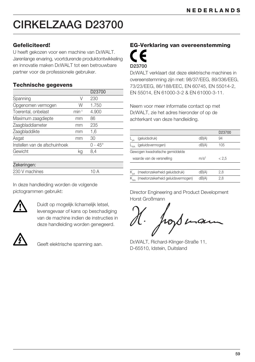 m/s2 < 2,5 KpA (meetonzekerheid geluidsdruk) dB(A) 2,8 KWA (meetonzekerheid geluidsvermogen) dB(A) 2,8 Gewogen kwadratische gemiddelde waarde van de versnelling Zekeringen: 230 V machines 10 A In deze handleiding worden de volgende pictogrammen gebruikt: Director Engineering and Product Development Horst Großmann Duidt op mogelijk lichamelijk letsel, levensgevaar of kans op beschadiging van de machine indien de instructies in deze handleiding worden genegeerd. Geeft elektrische spanning aan. DEWALT, Richard-Klinger-Straße 11, D-65510, Idstein, Duitsland