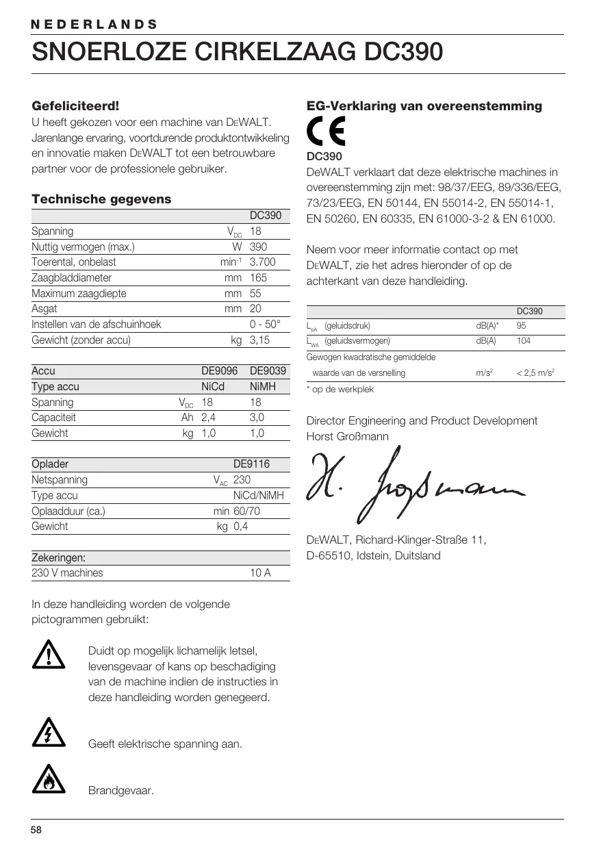 Gefeliciteerd! EG-Verklaring van overeenstemming U heeft gekozen voor een machine van DEWALT. Jarenlange ervaring, voortdurende produktontwikkeling en innovatie maken DEWALT tot een betrouwbare partner voor de professionele gebruiker. Technische gegevens Spanning Nuttig vermogen (max.) Toerental, onbelast Zaagbladdiameter Maximum zaagdiepte Asgat Instellen van de afschuinhoek Gewicht (zonder accu) DC390