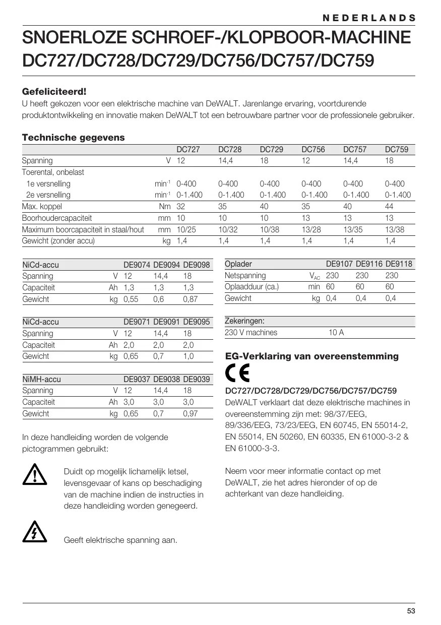 0,4 10 A EG-Verklaring van overeenstemming DC727/DC728/DC729/DC756/DC757/DC759 DeWALT verklaart dat deze elektrische machines in overeenstemming zijn met: 98/37/EEG, 89/336/EEG, 73/23/EEG, EN 60745, EN 55014-2, EN 55014, EN 50260, EN 60335, EN 61000-3-2 & EN 61000-3-3. Neem voor meer informatie contact op met DeWALT, zie het adres hieronder of op de achterkant van deze handleiding. Geeft elektrische spanning aan.