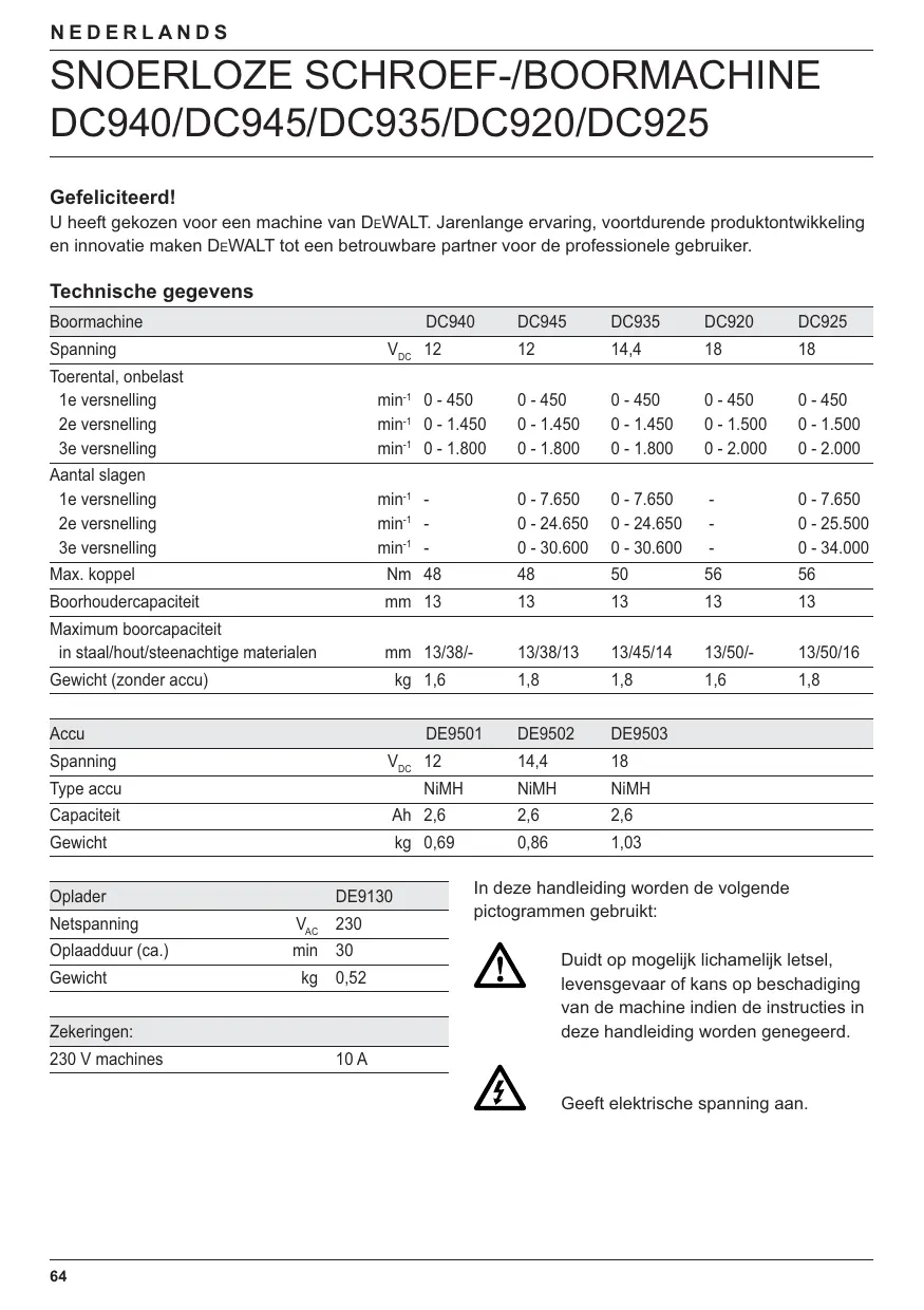 DC940/DC945/DC935/DC920/DC925 Gefeliciteerd! U heeft gekozen voor een machine van DEWALT. Jarenlange ervaring, voortdurende produktontwikkeling en innovatie maken DEWALT tot een betrouwbare partner voor de professionelle gebruiker. Technische gegevens Boormachine DC940 DC945 DC935 DC920 DC925 Spanning Vs 12 12 144 18 18 osrental, onbelast 1e versnelling min! 0-450 0-450 0-40 O0-450 0-450 2e versneling mint 0-1450 0-1450 0-1450 0-10 01.500 3e versneling min* 0-1800 0-1800 0-1800 0-2000 02.000 Aantal slagen 1e versnelling min 0-7.650 0-7650 - 0-7.650 2e versneling min 0-24650 0-24650 - 0-25.500 3e versneling min 0-30.600 0-30600 - 0-34.000 Max Koppel Nm 48 48 50 56 56 Boorhoudercapaciteit mm 13 E 13 E 13 Maximum boorcapaciteit in staal/hout/steenachige materialen mm 13/88 198813 1345/14 13/50. 13/0/6 Geuicht (zonder acou) ko 1.6 18 18 16 18 Acou DE9501 DE9502 DE9503 Spanning Vs 12 144 18 Type accu NiMH NMH NiMH Capacieit Ah 26 26 26 Gewicht Kg 0,69 0,86 1,03 GE GEES In deze handieïding worden de volgende Netsparning TE 20 pictogrammen gebruikt: Oplaadduur (ca) LE VAN Duidt op mogelik lichamelik letsel, Gewicht kg 0,52 L levensgevaar of kans op beschadiging van de machine indien de instructies in Zekeringen: deze handleiding worden genegeerd. 230 V machines 10A