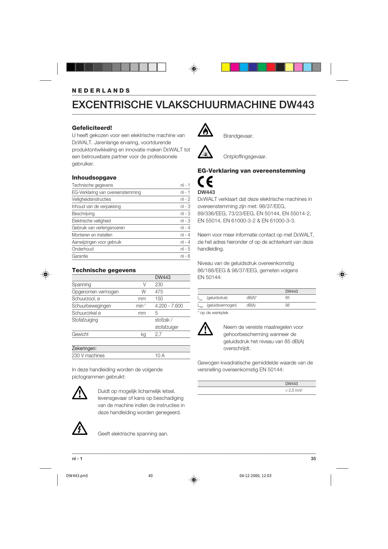 Gefeliciteerd! LN U heeft gekozen voor een elektrische machine van Brandgevaar. DEWALT. Jarenlange ervaring, voortdurende produktontwikkeling en innovatie maken DeWALT tot VAN een betrouwbare partner voor de professionele /A\ Ontplofingsgevaar. gebruiker. EG-Verklaring van overeenstemming Inhoudsopgave Technische gegevens ni-1 C € EG-Verklaring van overeenstemming ni-1 DW443 Veiligheidsinstructies ni-2 DEWALT verklaart dat deze elektrische machines in inhoud van de verpakking n-3 overeenstemming zin met: 98/37/EEG, Beschriving nl-3 89/336/EEG, 73/23/EEG, EN 50144, EN 55014-2, Elektrische veiigheid nl-3 EN 55014, EN 61000-3-2 & EN 61000-3-8. Gebruik van verlengsnoeren ni-4 Monteren en instellen nl-4 Neem voor meer informatie contact op met DEWALT, Aanwizingen voor gebruk n-4 zie het adres hieronder of op de achterkant van deze Onderhoud n-5 handieiding. Garantie n-6 Niveau van de geluidsdruk overeenkomstig Technische gegevens 86/188/EEG & 98/37/EEG, gemeten volgens DW443 EN 50144: Spanning V_ 230 Opgenomen vermogen W_ 475 DNS Schuurzoo!, o mm __ 150 L,. (geuidsdiuk) dB{A} 85 Schuurbewegingen min 4.200 - 7.600 La Geudsemogen dB œ Schuurcirkel à mm_5 * op de werkplek Stofafzuiging Stoizak 7 stofafzuiger ÂA Neem de vereiste maatregelen voor Gewicht Kg 27 gehoorbescherming wanneer de geluidsdruk het niveau van 85 dB(A) Zekeringen: overschrijdt. 230 V machines 10A Gewogen kwadratische gemiddelde waarde van de In deze handleiding worden de volgende versneling overeenkomstig EN 50144: pictogrammen gebruikt: DW443 VAN Duidt op mogelik lichamelik letsel, <25 ms levensgevaar of kans op beschadiging van de machine indien de instructies in deze handleiding worden genegeerd. À Geeit elektrische spanning aan. ni-1 35 DW443.pm5 40 04-12-2000, 12:03