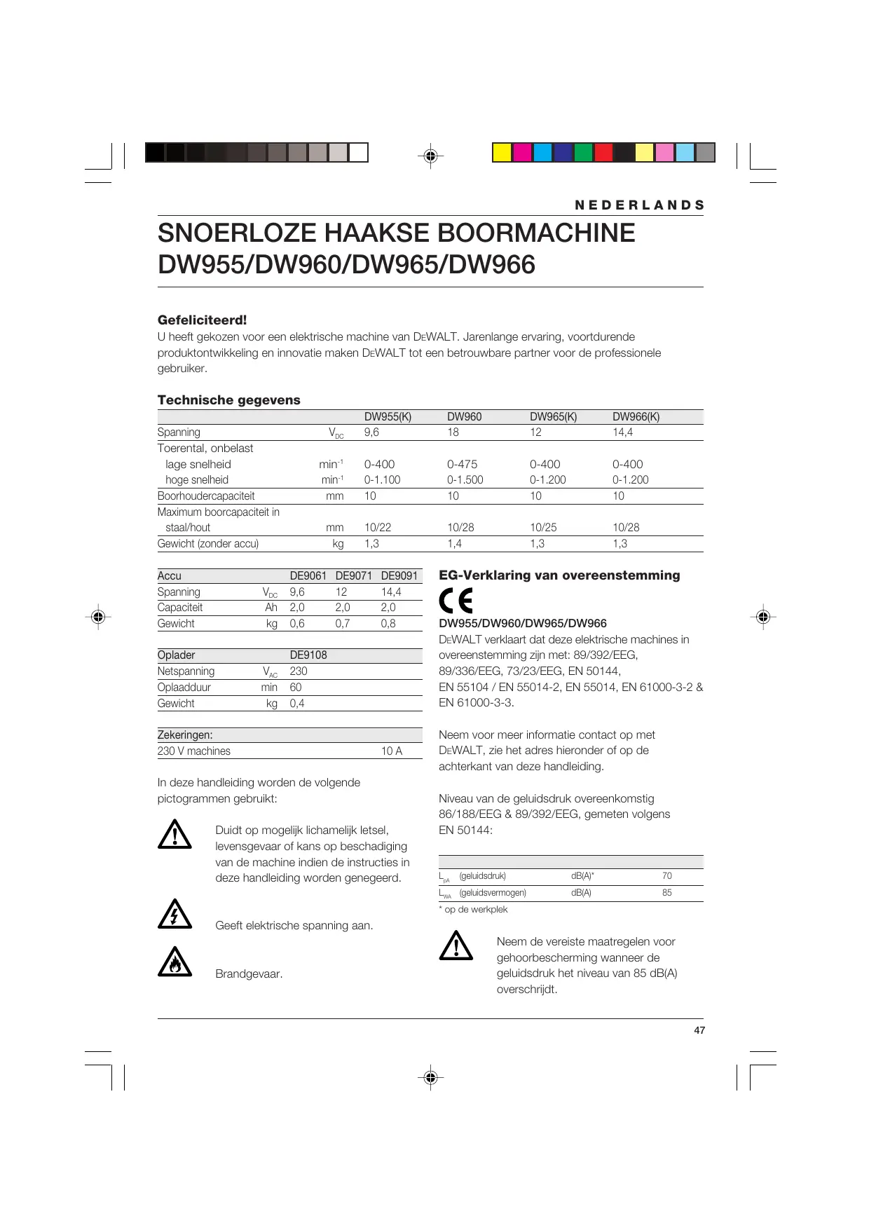 10/22 1,3 10/28 1,4 10/25 1,3 10/28 1,3 DE9071 2,0 0,7 Zekeringen: 230 V machines DE9091 14,4 2,0 0,8 10 A In deze handleiding worden de volgende pictogrammen gebruikt: Duidt op mogelijk lichamelijk letsel, levensgevaar of kans op beschadiging van de machine indien de instructies in deze handleiding worden genegeerd. EG-Verklaring van overeenstemming DW955/DW960/DW965/DW966 DEWALT verklaart dat deze elektrische machines in overeenstemming zijn met: 89/392/EEG, 89/336/EEG, 73/23/EEG, EN 50144, EN 55104 / EN 55014-2, EN 55014, EN 61000-3-2 & EN 61000-3-3. Neem voor meer informatie contact op met DEWALT, zie het adres hieronder of op de achterkant van deze handleiding. Niveau van de geluidsdruk overeenkomstig 86/188/EEG & 89/392/EEG, gemeten volgens EN 50144: LpA (geluidsdruk) dB(A)*