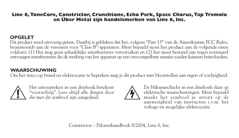 Ronde buizencompressie Als je op zoek bent naar een mooi gepolijst geluid, moet je dit voorbeeld eens instellen. Dan beschik je namelijk over een gelikte studiosound. Constrictor-Pilotenhandboek Registreer je product nu meteen op www.line6.com/register. Of vul de bijgevoegde registratiekaart in en stuur ze met de post op. Dan beschikken we over alle belangrijke gegevens en kunnen we je eventueel sneller helpen. Bovendien kunnen we je dan op de hoogte houden van productverbeteringen, nieuwe producten en andere belangrijke weetjes. Bedankt voor de moeite en succes met je muziek! Line 6, Inc. (“Line 6”), garandeert dat dit product, indien het bij een erkende Line 6-dealer in de VS of Canada werd gekocht, geen enkel gebrek vertoont en, vanaf de dag van de oorspronkelijke aankoop, gedurende één (1) jaar geen enkele ingreep behoeft. Gebruikers in andere landen kunnen bij de Line 6-dealer, waar ze het product gekocht hebben, informatie inwinnen over de plaatselijke garantiebepalingen. Tijdens de garantieperiode heeft Line 6 het recht om producten hetzij te herstellen, hetzij te vervangen, als er sprake is van een defect. Line 6 behoudt zich het recht voor om een teruggestuurd product zonder voorafgaande kennisgeving te updaten en alle voor een productverbetering noodzakelijke handelingen uit te voeren. Line 6 heeft het recht gebruikte onderdelen voor herstellingen of werken in het kader van de garantiebepalingen te gebruiken. Deze garantie geldt voor de eerste koper, die het product bij een erkende dealer heeft aangekocht. De garantie kan echter overgaan op de persoon, die het product op een later tijdstip koopt, indien dit binnen de garantieperiode gebeurt en indien de nieuwe eigenaar Line 6 daarvan d.m.v. de volgende documenten op de hoogte brengt: (i) alle gegevens voor de registratie van de garantie (zie de garantiekaart) in naam van de nieuwe eigenaar, (ii) een bewijs voor de wettelijke overdracht opgemaakt binnen de 30 dagen na de aankoop, (iii) een fotokopie van de originele factuur. Line 6 bepaalt als enige of de garantie al dan niet overgaat op de nieuwe eigenaar. Dit is de enige garantie waar jij recht op hebt. Bij deze verbiedt Line 6 alle personen, met inbegrip van dealers en vertegenwoordigers, om in naam van Line 6 verantwoordelijkheid op te nemen of waarborgen te geven die buiten het bestek van deze bepalingen vallen. Garantiebepalingen Line 6 heeft op elk moment het recht om een bewijs van de oorspronkelijke aankoop in de vorm van de originele factuur of een ontvangstbewijs te eisen. Herstellingen en onderhoudswerken aan Line 6-apparaten mogen uitsluitend in de fabriek of door een erkende herstellingsdienst worden uitgevoerd. Line 6 beslist als enige of een herstellingsdienst de voorgestelde herstelling al dan niet mag uitvoeren. Bij het uitvoeren van niet toegelaten onderhoudswerken, herstellingen of wijzigingen aan het product vervalt de garantie onmiddellijk.