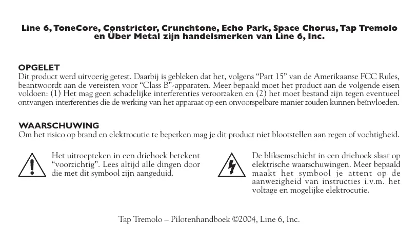 Slotakkoord Kies deze instelling alvorens het laatste akkoord van een nummer te spelen. De peakfollower zorgt ervoor dat de tremolo aanvankelijk heel snel “bibbert” en dan geleidelijk aan vertraagt naarmate de noten uitsterven. Hiermee maak je pas indruk. Tap Tremolo-Pilotenhandboek Registreer je product nu meteen op www.line6.com/register. Of vul de bijgevoegde registratiekaart in en stuur ze met de post op. Dan beschikken we over alle belangrijke gegevens en kunnen we je eventueel sneller helpen. Bovendien kunnen we je dan op de hoogte houden van productverbeteringen, nieuwe producten en andere belangrijke weetjes. Bedankt voor de moeite en succes met je muziek! Line 6, Inc. (“Line 6”), garandeert dat dit product, indien het bij een erkende Line 6-dealer in de VS of Canada werd gekocht, geen enkel gebrek vertoont en, vanaf de dag van de oorspronkelijke aankoop, gedurende één (1) jaar geen enkele ingreep behoeft. Gebruikers in andere landen kunnen bij de Line 6-dealer, waar ze het product gekocht hebben, informatie inwinnen over de plaatselijke garantiebepalingen. Tijdens de garantieperiode heeft Line 6 het recht om producten hetzij te herstellen, hetzij te vervangen, als er sprake is van een defect. Line 6 behoudt zich het recht voor om een teruggestuurd product zonder voorafgaande kennisgeving te updaten en alle voor een productverbetering noodzakelijke handelingen uit te voeren. Line 6 heeft het recht gebruikte onderdelen voor herstellingen of werken in het kader van de garantiebepalingen te gebruiken. Deze garantie geldt voor de eerste koper, die het product bij een erkende dealer heeft aangekocht. De garantie kan echter overgaan op de persoon, die het product op een later tijdstip koopt, indien dit binnen de garantieperiode gebeurt en indien de nieuwe eigenaar Line 6 daarvan d.m.v. de volgende documenten op de hoogte brengt: (i) alle gegevens voor de registratie van de garantie (zie de garantiekaart) in naam van de nieuwe eigenaar, (ii) een bewijs voor de wettelijke overdracht opgemaakt binnen de 30 dagen na de aankoop, (iii) een fotokopie van de originele factuur. Line 6 bepaalt als enige of de garantie al dan niet overgaat op de nieuwe eigenaar. Dit is de enige garantie waar jij recht op hebt. Bij deze verbiedt Line 6 alle personen, met inbegrip van dealers en vertegenwoordigers, om in naam van Line 6 verantwoordelijkheid op te nemen of waarborgen te geven die buiten het bestek van deze bepalingen vallen. Garantiebepalingen Line 6 heeft op elk moment het recht om een bewijs van de oorspronkelijke aankoop in de vorm van de originele factuur of een ontvangstbewijs te eisen. Herstellingen en onderhoudswerken aan Line 6-apparaten mogen uitsluitend in de fabriek of door een erkende herstellingsdienst worden uitgevoerd. Line 6 beslist als enige of een herstellingsdienst de voorgestelde herstelling al dan niet mag uitvoeren. Bij het uitvoeren van niet toegelaten onderhoudswerken, herstellingen of wijzigingen aan het product vervalt de garantie onmiddellijk.