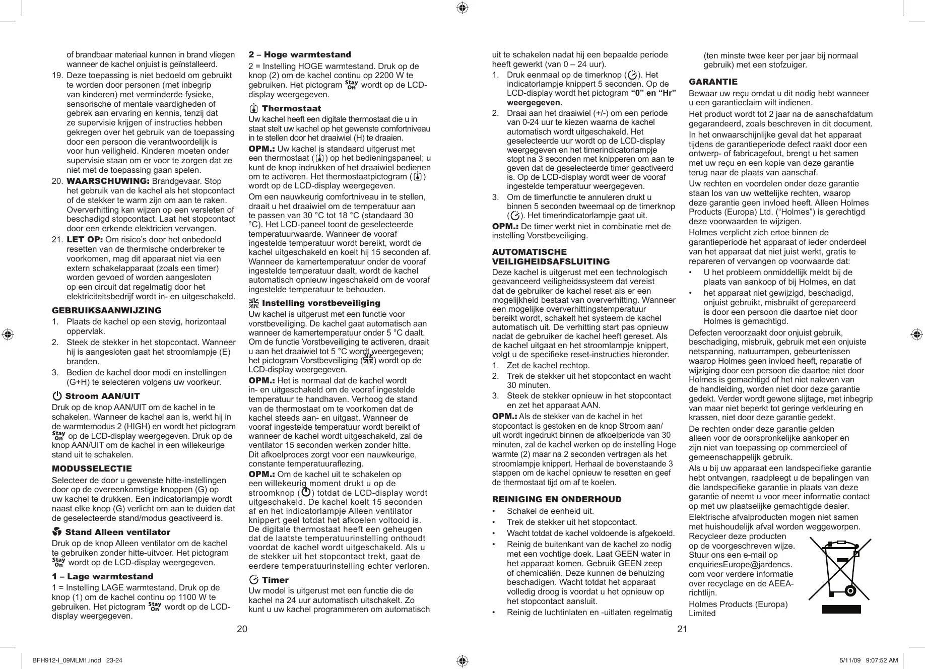 GARANTIE Bewaar uw reçu omdat u dit nodig hebt wanneer u een garantieclaim wilt indienen. Het product wordt tot 2 jaar na de aanschafdatum gegarandeerd, zoals beschreven in dit document. In het onwaarschinlijke geval dat het apparaat tijdens de garantieperiode defect raakt door een ontwerp- of fabricagefout, brengt u het samen met uw reçu en een kopie van deze garantie terug naar de plaats van aanschaf. Uw rechten en voordelen onder deze garantie staan los van uw wettelike rechten, waarop deze garantie geen invioed heeft. Alleen Holmes Products (Europa) Ltd. (“Holmes”) is gerechtigd deze voorwaarden te wijzigen. Holmes verplicht zich ertoe binnen de garantieperiode het apparaat of ieder onderdeel van het apparaat dat niet juist werkt, gratis te repareren of vervangen op voorwaarde dat: + U het probleem onmiddellik meldt bij de plaats van aankoop of bi) Holmes, en dat + het apparaat niet gewijzigd, beschadigd, onjuist gebruikt, misbruikt of gerepareerd is door een persoon die daartoe niet door Holmes is gemachtigd. Defecten veroorzaakt door onjuist gebruik, beschadiging, misbruik, gebruik met een onjuiste netspanning, natuurrampen, gebeurtenissen waarop Holmes geen invioed heeft, reparatie of wijziging door een persoon die daartoe niet door Holmes is gemachtigd of het niet naleven van de handleiding, worden niet door deze garantie gedekt. Verder wordt gewone slitage, met inbegrip van maar niet beperkt tot geringe verkleuring en krassen, niet door deze garantie gedekt. De rechten onder deze garantie gelden alleen voor de oorspronkelike aankoper en Zin niet van toepassing op commercieel of gemeenschappelik gebruik. Als u bij uw apparaat een landspecifieke garantie hebt ontvangen, raadpleegt u de bepalingen van die landspecifieke garantie in plaats van deze garantie of neemt u voor meer informatie contact op met uw plaatselike gemachtigde dealer. Elektrische afvalproducten mogen niet samen met huishoudelik afval worden weggeworpen. Recycleer deze producten op de voorgeschreven wijze. Stuur ons een e-mail op enquiriesEurope@jardencs. com voor verdere informatie over recyclage en de AEEA- richtlin. Holmes Products (Europa) Limited