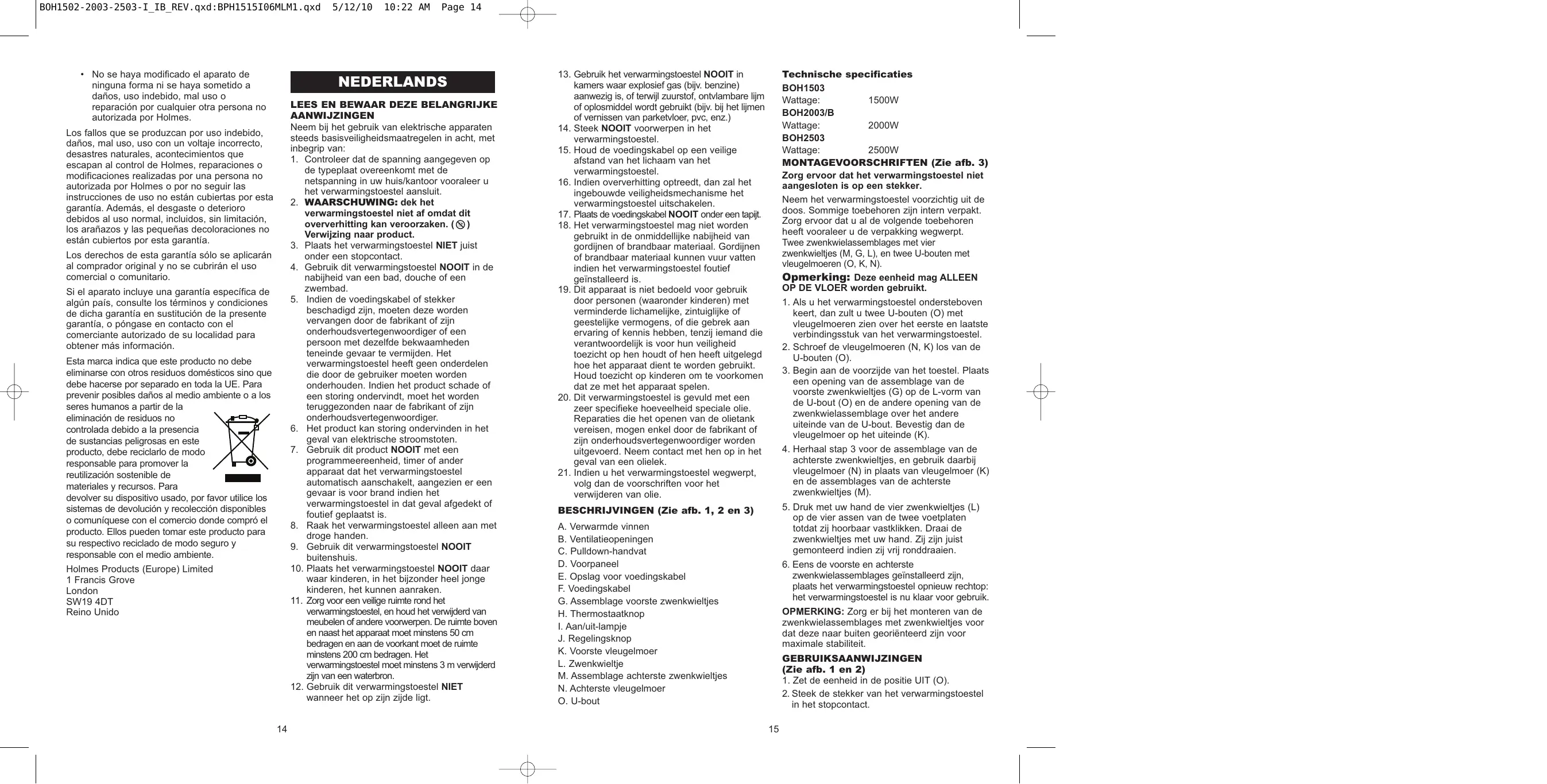 I. Luz de Encendido J. Perilla de Control K. Tuerca de Mariposa Anterior L. Rueda M. Ensamblaje de Rueda Posterior N. Tuerca de Mariposa Posterior 0. Perno en U Especificaciones Técnicas BOH1503 Vataje: Retire con cuidado el calefactor de la caja. Algunos accesorios están embalados en el interior. Por favor asegúrese de tener los siguientes accesorios antes de tirar el embalaje. 2 Ensamblajes de rueda con cuatro ruedas (M, G, L) y 2 pernos en U con tuercas de mariposa (O, K, N). NOTA: Esta unidad SOLO PUEDE UTILIZARSE EN EL PISO. 4. Repita el paso 3 para el ensamblaje de rueda posterior, utilizando la tuerca mariposa (N) en lugar de la tuerca mariposa (K) y los ensamblajes de rueda posteriores (M). 12