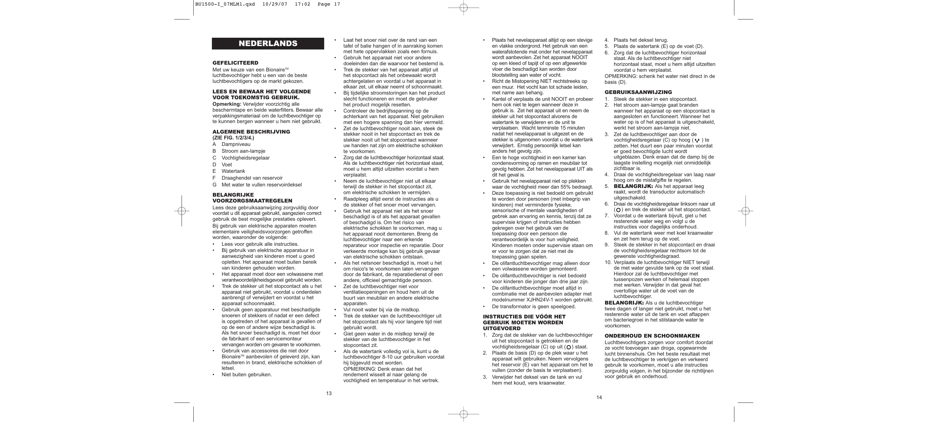 GEBRUIKSAANWIJZING BU1500 BIONAIRE