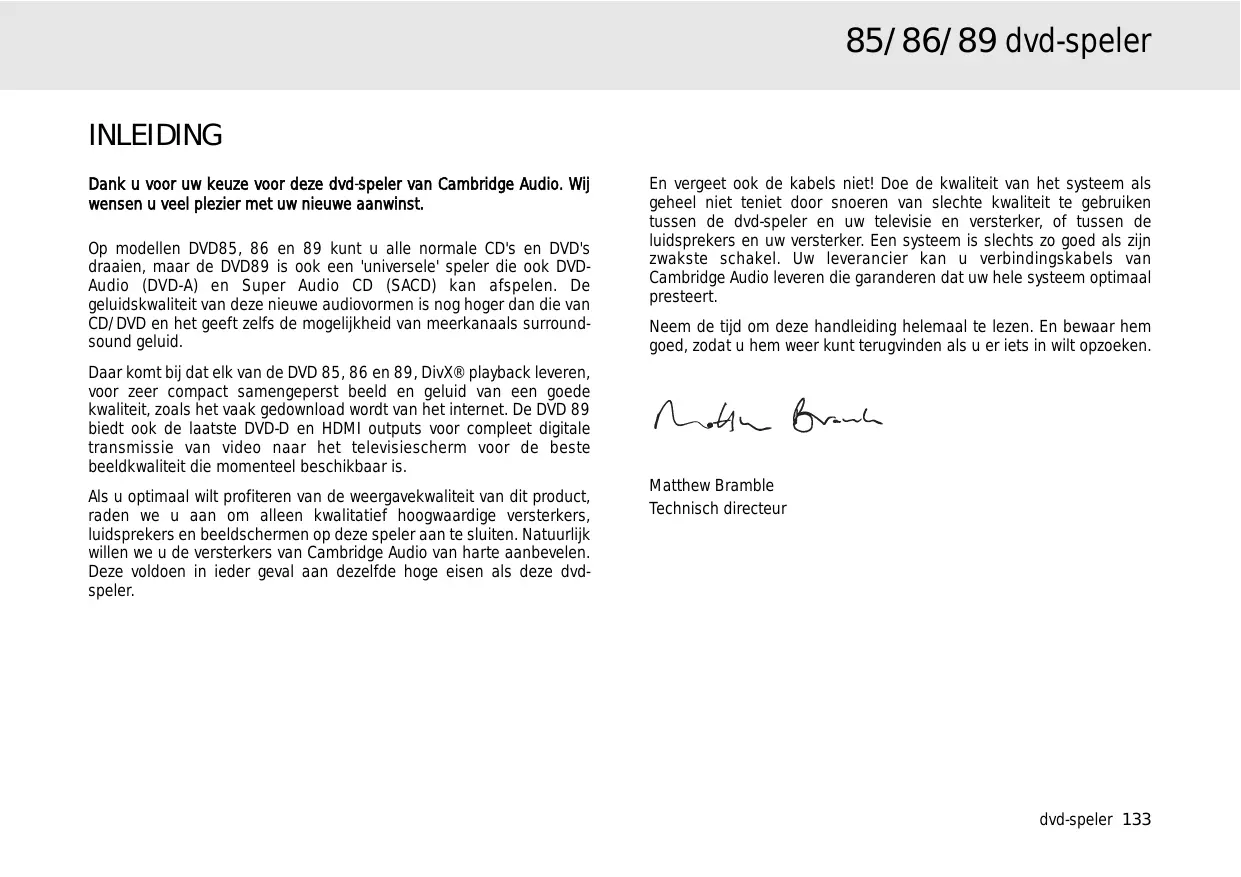 En vergeet ook de kabels niet! Doe de kwaliteit van het systeem als geheel niet teniet door snoeren van slechte kwaliteit te gebruiken tussen de dvd-speler en uw televisie en versterker, of tussen de luidsprekers en uw versterker. Een systeem is slechts zo goed als zijn zwakste schakel. Uw leverancier kan u verbindingskabels van Cambridge Audio leveren die garanderen dat uw hele systeem optimaal presteert. Neem de tijd om deze handleiding helemaal te lezen. En bewaar hem goed, zodat u hem weer kunt terugvinden als u er iets in wilt opzoeken.