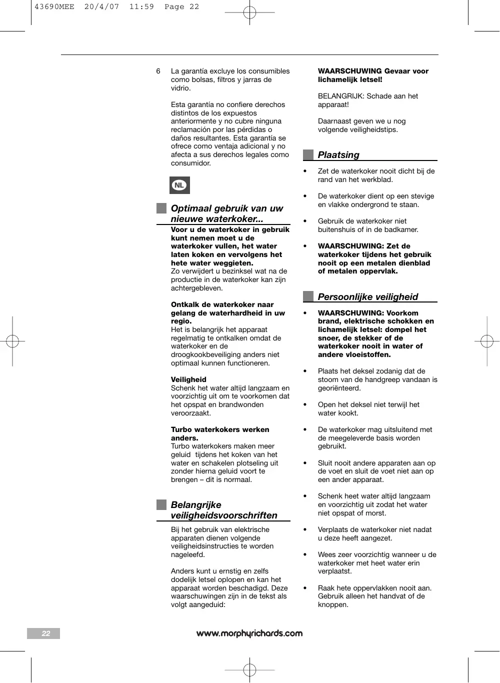 Wanneer het apparaat is vervangen tijdens de garantieperiode (2 jaar), loopt de garantie voor het nieuwe product vanaf de originele aankoopdatum. Daarom is het belangrijk dat uw aankoopbewijs of factuur de originele aankoopdatum vermeldt. Tire o melhor partido do seu novo jarro eléctrico... Deze garantie geldt alleen wanneer het apparaat is gebruikt conform de instructies van de fabrikant. Zo moeten apparaten volgens de gebruiksaanwijzing ontkalkt zijn en moeten filters schoongehouden worden. Desincruste de acordo com a qualidade da água da sua área É importante retirá-los, caso contrário o desempenho do jarro eléctrico e a sua operação de desligamento automático serão afectados. UITZONDERINGEN Morphy Richards zal de goederen niet vervangen of repareren volgens de garantievoorwaarden wanneer Retire a água do jarro eléctrico depois de a água ferver Para limpar quaisquer resíduos acumulados no jarro eléctrico após o período de fabricação. Segurança em primeiro lugar Verta sempre água de forma lenta e cuidadosa para evitar salpicos de água a ferver.