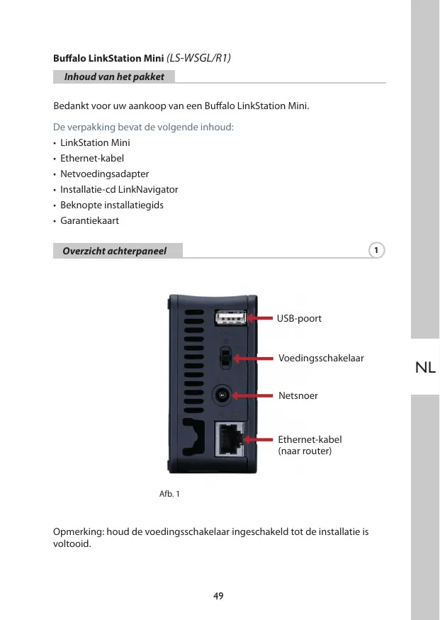 Buffalo LinkStation Mini (LS-WSGL/R1) Inhoud van het pakket Bedankt voor uw aankoop van een Buffalo LinkStation Mini. De verpakking bevat de volgende inhoud: • LinkStation Mini • Ethernet-kabel • Netvoedingsadapter • Installatie-cd LinkNavigator • Beknopte installatiegids • Garantiekaart Overzicht achterpaneel