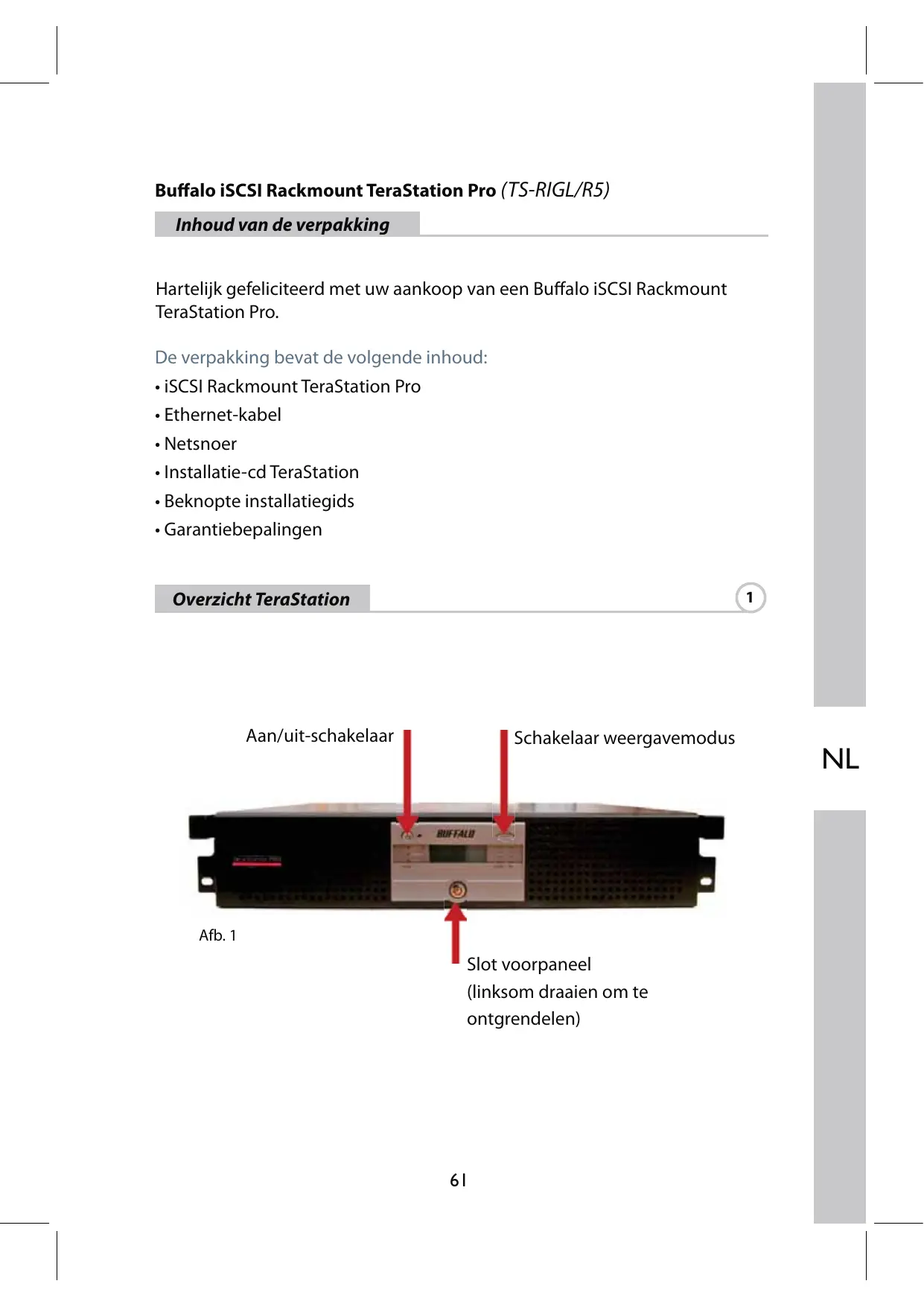 Buffalo iSCSI Rackmount TeraStation Pro (TS-RIGL/R5) Inhoud van de verpakking Hartelijk gefeliciteerd met uw aankoop van een Buffalo iSCSI Rackmount TeraStation Pro. De verpakking bevat de volgende inhoud: • iSCSI Rackmount TeraStation Pro • Ethernet-kabel • Netsnoer • Installatie-cd TeraStation • Beknopte installatiegids • Garantiebepalingen