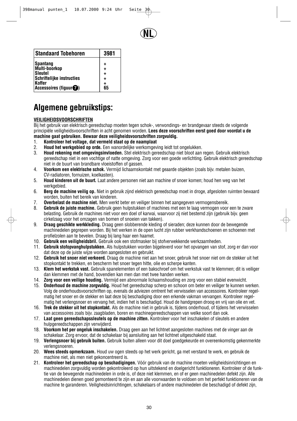 NL moeten worden gerepareerd of vervangen door een erkende vakman. Gebruik de machine niet, wanneer de schakelaar deze niet kan aan- en uitschakelen. 22. Attentie! Gebruik de machine en haar accessoires volgens deze veiligheidsvoorschriften en voor het doel waarvoor de machine in kwestie bestemd is, daarbij rekening houdend met de werkomstandigheden en het werk wat gedaan moet worden. Het gebruik van de machine voor afwijkende toepassingen, waarvan men normaliter mag verwachten dat de machine in kwestie deze niet kan uitvoeren, kan gevaar opleveren. 23. Laat reparaties alleen door een erkende vakman uitvoeren. Dit elektrisch gereedschap voldoet aan de desbetreffende veiligheidsvoorschriften. Reparaties mogen alleen worden uitgevoerd door vakkundig personeel en met originele onderdelen; dit ter voorkoming van ongevallen voor de gebruiker. VEILIGHEID • • • • • • • • • • • • • • • • • •