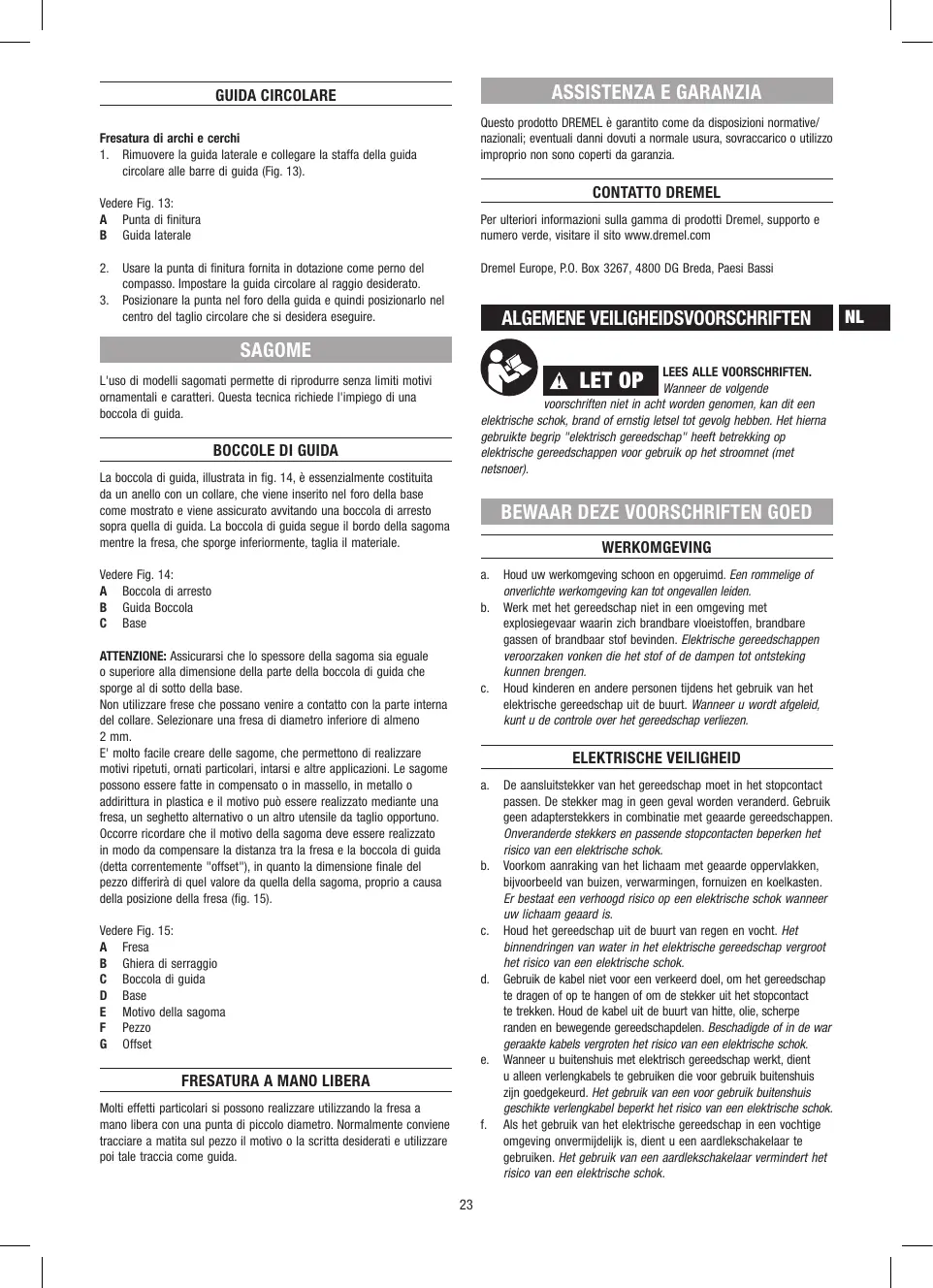 SERVICE EN GARANTIE PERSONLIG SIKKERHED Op dit DREMEL product wordt garantie verleend overeenkomstig de wettelijke/landspecifieke voorschriften; beschadiging op grond van normale slijtage, overbelasting of onjuiste bediening zijn uitgesloten van de garantie.
