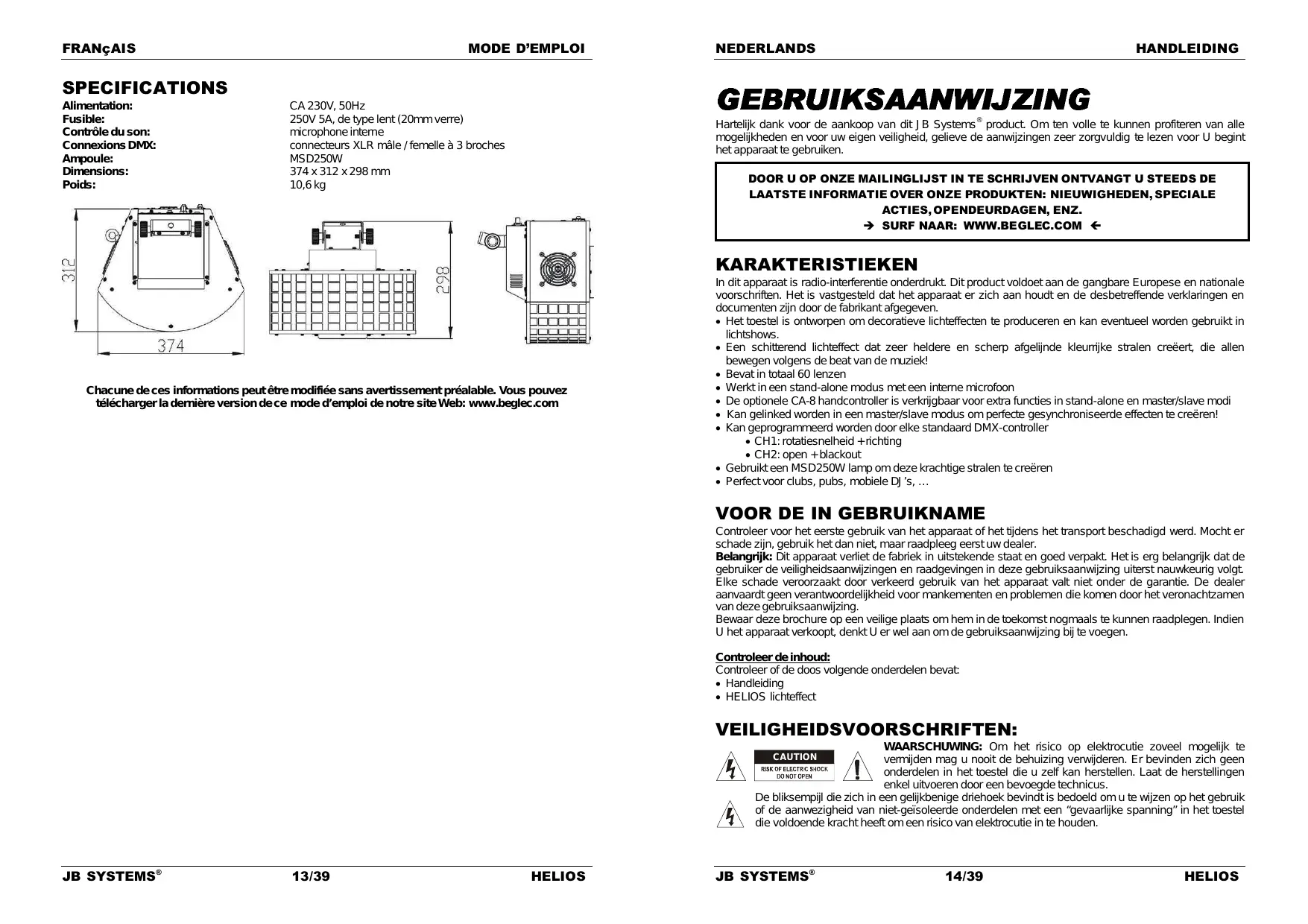 KARAKTERISTIEKEN Chacune de ces informations peut être modifiée sans avertissement préalable. Vous pouvez télécharger la dernière version de ce mode d’emploi de notre site Web: www.beglec.com In dit apparaat is radio-interferentie onderdrukt. Dit product voldoet aan de gangbare Europese en nationale voorschriften. Het is vastgesteld dat het apparaat er zich aan houdt en de desbetreffende verklaringen en documenten zijn door de fabrikant afgegeven. Het toestel is ontworpen om decoratieve lichteffecten te produceren en kan eventueel worden gebruikt in lichtshows. Een schitterend lichteffect dat zeer heldere en scherp afgelijnde kleurrijke stralen creëert, die allen bewegen volgens de beat van de muziek! Bevat in totaal 60 lenzen Werkt in een stand-alone modus met een interne microfoon De optionele CA-8 handcontroller is verkrijgbaar voor extra functies in stand-alone en master/slave modi Kan gelinked worden in een master/slave modus om perfecte gesynchroniseerde effecten te creëren! Kan geprogrammeerd worden door elke standaard DMX-controller CH1: rotatiesnelheid + richting CH2: open + blackout Gebruikt een MSD250W lamp om deze krachtige stralen te creëren Perfect voor clubs, pubs, mobiele DJ’s, …