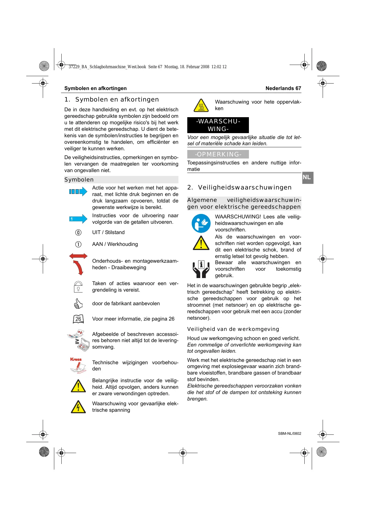 in min -1 Aantal slagen in min-1 Netspanning in V / frequentie in Hz Nominaal vermogen P in Watt Hoekmaat in mm Spanhalsdiameter in mm SBM-NL/0802 37229_BA_Schlagbohrmaschine_West.book Seite 72 Montag, 18. Februar 2008 12:02 12 72 Nederlands Bediening Bij het gebruik van verlengsnoeren: alleen voor dit gebruik toegelaten verlengsnoeren met voldoende diameter gebruiken. Anders kan prestatieverlies bij het apparaat en oververhitting van het snoer optreden. Beschadigde verlengsnoeren a.u.b. vervangen. Gewicht in kg Boren of slagboren in beton - max. ø in mm Boren of slagboren in tegels - max. ø in mm Boren of slagboren in zandsteen max. ø in mm Extra handgreep Gebruik uw elektrische gereedschap alleen met de extra handgreep. Het verlies van de controle over het elektrische gereedschap kan tot verwondingen leiden.
