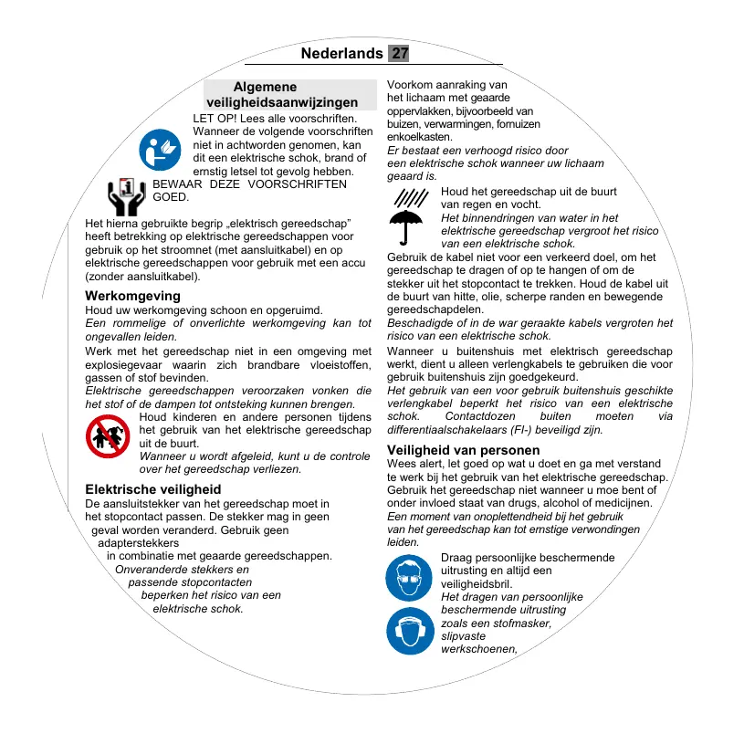 GOED. Het hierna gebruikte begrip „elektrisch gereedschap” heeft betrekking op elektrische gereedschappen voor gebruik op het stroomnet (met aansluitkabel) en op elektrische gereedschappen voor gebruik met een accu (zonder aansluitkabel). Werkomgeving Houd uw werkomgeving schoon en opgeruimd. Een rommelige of onverlichte werkomgeving kan tot ongevallen leiden. Werk met het gereedschap niet in een omgeving met explosiegevaar waarin zich brandbare vloeistoffen, gassen of stof bevinden. Elektrische gereedschappen veroorzaken vonken die het stof of de dampen tot ontsteking kunnen brengen. Houd kinderen en andere personen tijdens het gebruik van het elektrische gereedschap uit de buurt. Wanneer u wordt afgeleid, kunt u de controle over het gereedschap verliezen. Elektrische veiligheid De aansluitstekker van het gereedschap moet in het stopcontact passen. De stekker mag in geen geval worden veranderd. Gebruik geen adapterstekkers in combinatie met geaarde gereedschappen. Onveranderde stekkers en passende stopcontacten beperken het risico van een elektrische schok. Voorkom aanraking van het lichaam met geaarde oppervlakken, bijvoorbeeld van buizen, verwarmingen, fornuizen enkoelkasten. Er bestaat een verhoogd risico door een elektrische schok wanneer uw lichaam geaard is. Houd het gereedschap uit de buurt van regen en vocht. Het binnendringen van water in het elektrische gereedschap vergroot het risico van een elektrische schok. Gebruik de kabel niet voor een verkeerd doel, om het gereedschap te dragen of op te hangen of om de stekker uit het stopcontact te trekken. Houd de kabel uit de buurt van hitte, olie, scherpe randen en bewegende gereedschapdelen. Beschadigde of in de war geraakte kabels vergroten het risico van een elektrische schok. Wanneer u buitenshuis met elektrisch gereedschap werkt, dient u alleen verlengkabels te gebruiken die voor gebruik buitenshuis zijn goedgekeurd. Het gebruik van een voor gebruik buitenshuis geschikte verlengkabel beperkt het risico van een elektrische schok. Contactdozen buiten moeten via differentiaalschakelaars (FI-) beveiligd zijn. Veiligheid van personen Wees alert, let goed op wat u doet en ga met verstand te werk bij het gebruik van het elektrische gereedschap. Gebruik het gereedschap niet wanneer u moe bent of onder invloed staat van drugs, alcohol of medicijnen. Een moment van onoplettendheid bij het gebruik van het gereedschap kan tot ernstige verwondingen leiden. Draag persoonlijke beschermende uitrusting en altijd een veiligheidsbril. Het dragen van persoonlijke beschermende uitrusting zoals een stofmasker, slipvaste werkschoenen, Nederlands 28 Een veiligheidshelm of aard en het gebruik van het elektrische gereedschap, vermindert het risico van verwondingen. Voorkom per ongeluk inschakelen. Controleer dat deschakelaar in de stand „UIT“ staat voordat u de stekker in het stopcontact steekt. Wanneer u bij het dragen van het gereedschap uw vinger aan de schakelaar hebt of wanneer u het gereedschap ingeschakeld op de stroomvoorziening aansluit, kan dit tot ongevallen leiden. Verwijder instelgereedschappen of schroefsleutels voordat u het gereedschap inschakelt. Een instelgereedschap of sleutel in een draaiend deel van het gereedschap kan tot verwondingen leiden. Overschat uzelf niet. Zorg ervoor dat u stevig staat en steeds in evenwicht blijft. Daardoor kunt u het gereedschap in onverwachte situaties beter onder controle houden. Draag geschikte kleding. Draag geen loshangende kleding of sieraden. Houd haren, kleding en handschoenen uit de buurt van bewegende delen. Loshangende kleding, sieraden en lange haren kunnen door bewegende delen worden meegenomen. Wanneer stofafzuigings- of stofopvangvoorzieningen kunnen worden gemonteerd, dient u zich ervan te verzekeren dat deze zijn aangesloten en juist worden gebruikt. Het gebruik van deze voorzieningen beperkt het gevaar door stof. Werkstuk borgen! Om het werkstuk vast te houden spanvoorzieningen of bankschroef gebruiken. Dat is veiliger dan het vasthouden met de hand en maakt de bediening van de machine met beide handenmogelijk. Gebruik en onderhoud van elektrische gereedschappen Overbelast het gereedschap niet. Gebruik voor uw werkzaamheden het daarvoor bestemde elektrische gereedschap. Met het passende elektrische gereedschap werkt u beter en veiliger binnen het aangegeven capaciteitsbereik. Gebruik geen elektrisch gereedschap waarvan de schakelaar defect is. Elektrisch gereedschap dat niet meer kan worden in- of uitgeschakeld, is gevaarlijk en moet worden gerepareerd. Trek de stekker uit het stopcontact voordat u het gereedschap instelt, toebehoren wisselt of het gereedschapweglegt. Deze voorzorgsmaatregel voorkomt onbedoeld starten van het gereedschap. Bewaar niet-gebruikte elektrische gereedschappen buiten bereik van kinderen. Laat het gereedschap niet gebruiken door personen die er niet mee vertrouwd zijn en deze aanwijzingen niet hebben gelezen. Elektrische gereedschappen zijn gevaarlijk wanneer deze door onervaren personen worden gebruikt. Verzorg het gereedschap zorgvuldig. Controleer of bewegende delen van het gereedschap correct functioneren en niet vastklemmen en of onderdelen zodanig gebroken of beschadigd zijn dat de werking van het gereedschap nadelig wordt beïnvloed. Laat beschadigde delen repareren voordat u het gereedschap gebruikt. Veel ongevallen hebben hun oorzaak in slecht onderhouden elektrische gereedschappen. Houd snijdende inzetgereedschappen scherp en schoon. Zorgvuldig onderhouden snijdende inzetgereedschappen met scherpe snijkanten klemmen minder snel vast en zijn gemakkelijker te geleiden. Nederlands 29 Gebruik elektrische gereedschappen, toebehoren, inzetgereedschappen en dergelijke volgens deze aanwijzingen en zoals voor dit speciale gereedschapstype voorgeschreven. Let daarbij op de arbeidsomstandigheden en de uit te voeren werkzaamheden. Het gebruik van elektrische gereedschappen voor andere dan de voorziene toepassingen kan tot gevaarlijke situaties leiden. Ste