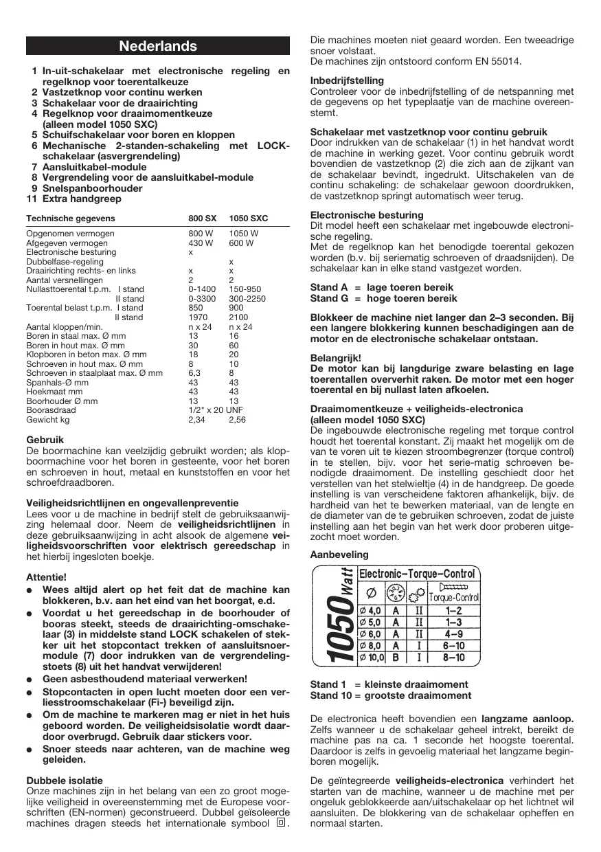 Inbedrijfstelling Controleer voor de inbedrijfstelling of de netspanning met de gegevens op het typeplaatje van de machine overeenstemt. Schakelaar met vastzetknop voor continu gebruik Door indrukken van de schakelaar (1) in het handvat wordt de machine in werking gezet. Voor continu gebruik wordt bovendien de vastzetknop (2) die zich aan de zijkant van de schakelaar bevindt, ingedrukt. Uitschakelen van de continu schakeling: de schakelaar gewoon doordrukken, de vastzetknop springt automatisch weer terug. Electronische besturing Dit model heeft een schakelaar met ingebouwde electronische regeling. Met de regelknop kan het benodigde toerental gekozen worden (b.v. bij seriematig schroeven of draadsnijden). De schakelaar kan in elke stand vastgezet worden. Stand A = lage toeren bereik Stand G = hoge toeren bereik Blokkeer de machine niet langer dan 2–3 seconden. Bij een langere blokkering kunnen beschadigingen aan de motor en de electronische schakelaar ontstaan. Belangrijk! De motor kan bij langdurige zware belasting en lage toerentallen oververhit raken. De motor met een hoger toerental en bij nullast laten afkoelen. Draaimomentkeuze + veiligheids-electronica (alleen model 1050 SXC) De ingebouwde electronische regeling met torque control houdt het toerental konstant. Zij maakt het mogelijk om de van te voren uit te kiezen stroombegrenzer (torque control) in te stellen, bijv. voor het serie-matig schroeven benodigde draaimoment. De instelling geschiedt door het verstellen van het stelwieltje (4) in de handgreep. De goede instelling is van verscheidene faktoren afhankelijk, bijv. de hardheid van het te bewerken materiaal, van de lengte en de diameter van de te gebruiken schroeven, zodat de juiste instelling aan het begin van het werk door proberen uitgezocht moet worden. Aanbeveling Stand 1 = kleinste draaimoment Stand 10 = grootste draaimoment De electronica heeft bovendien een langzame aanloop. Zelfs wanneer u de schakelaar geheel intrekt, bereikt de machine pas na ca. 1 seconde het hoogste toerental. Daardoor is zelfs in gevoelig materiaal het langzame beginboren mogelijk. De geïntegreerde veiligheids-electronica verhindert het starten van de machine, wanneer u de machine met per ongeluk geblokkeerde aan/uitschakelaar op het lichtnet wil aansluiten. De blokkering van de schakelaar opheffen en normaal starten. Verandering van de draairichting (normale draairichting „rechtsom”) De draairichting van de gereedschapsas wordt met de draairichtingomschakelaar (3) veranderd. R = rechtsom L = linksom Belangrijk! Druk de draairichtingomschakelaar 9 door tot aan de aanslag op het huis, dus tot de schakelaar merkbaar vastklikt. De draairichtingomschakelaar is eenvoudig te bedienen, wanneer u deze met duim en wijs- c.q. middelvinger aan beide kanten aanraakt. Opgelet! Verandering van de draairichting alleen met stilstaande machine! Het slagboormechanisme bij gebruik van de machine als schroevedraaier beslist uitschakelen. Het omschakelen geschiedt door de schakelaar (5). De draairichtingomschakelaar voorkomt in de middelste stand LOCK het per ongeluk indrukken van de dubbelfase-schakelaar (1), b.v. tijdens het wisselen van het gereedschap of tijdens de montage/demontage van de boorhouder. Klopboorinrichting De machine heeft een vast ingebouwd klopwerk en is om te schakelen van boren naar klopboren. Door aanraking van de schakelaar (5) kan gedurende het werken naar keuze van boren naar klopboren, of omgekeerd, geschakeld worden. Stand boren Schakelschuif (5) naar links in de richting boren drukken. Stand klopboren Schakelschuif (5) naar rechts in de richting kloppen drukken. Mechanische twee-standen-schakeling Het omschakelen geschiedt door draaien van de draaiknop (6) op de bovenkant van de machine. Stand 1 = machine loopt langzaam Stand 2 = machine loopt snel De twee-standen-schakeling levert voordelen op tijdens het boren en klopboren met kleine boordiameters tot ca. 8 mm. Aandrijving = schakelstand 2. Bij grote boordiameters en bij roerwerkzaamheden aandrijving = schakeltstand 1. De in de omschakeling van de aandrijving geïntegreerde LOCK-functie – Draaiknop (6) in stand LOCK – is gunstig tijdens de montage en demontage van de boorhouder. De LOCK-stand vergemakkelijkt ook het wisselen van het gereedschap zonder sleutel bij gebruik van een snelspanboorhouder en maakt maximale spankracht tijdens het vastzetten van het gereedschap mogelijk. Veiligheids-slipkoppeling De slipkoppeling treedt in werking, zodra het in de machine vastgezette gereedschap overbelast, plotseling afgeremd of vastgeklemd wordt. Terwijl motor en aandrijving doordraaien, blijft het gereedschap stilstaan. Motor en aandrijving zijn tegen overbelasting beschermd, een plotselinge belasting van de tandwielen is uitgesloten. Snelspanboorhouder Deze boorhouder is speciaal voor klopboormachines ontwikkeld. De boorhouder heeft een speciale openingsvergrendeling die een ongewild losraken van de boor verhindert. Op gebruikelijke wijze spannen door de huls gewoon tot aan de aanslag te draaien. Een duidelijk hoor- en merkbaar klikken bevestigt de werking van de spankrachtvergrendeling. Spannen en openen van de boorhouder door vasthouden van de borgring. Schroeven De schroevedraaierstiften (bits) kunt u direct in de kiembus van de boor inspannen. Gebruik bij voorkeur kruiskopschroeven. Dank zij de zelfcentrering kan er veilig gewerkt worden. Let erop, dat ook steeds de passende schroevedraaierstiften gebruikt worden. Draadsnijden De klopboormachine is door de ingebouwde electronica en draairichtingomschakeling ook geschikt om schroefdraad te snijden. Het gebruik van machinedraadtappen wordt aanbevolen. De draadtap wordt in de boorhouder ingespannen. De elektronische besturing is zeer gevoelig en dient dienovereenkomstig te worden bediend om het afbreken van de draadtap – vooral bij het draadsnijden in voorgeboorde gaten – te vermijden. Het benodigde draaimoment kan met de regelknop in de schakelaar (1) en met behulp van de dra