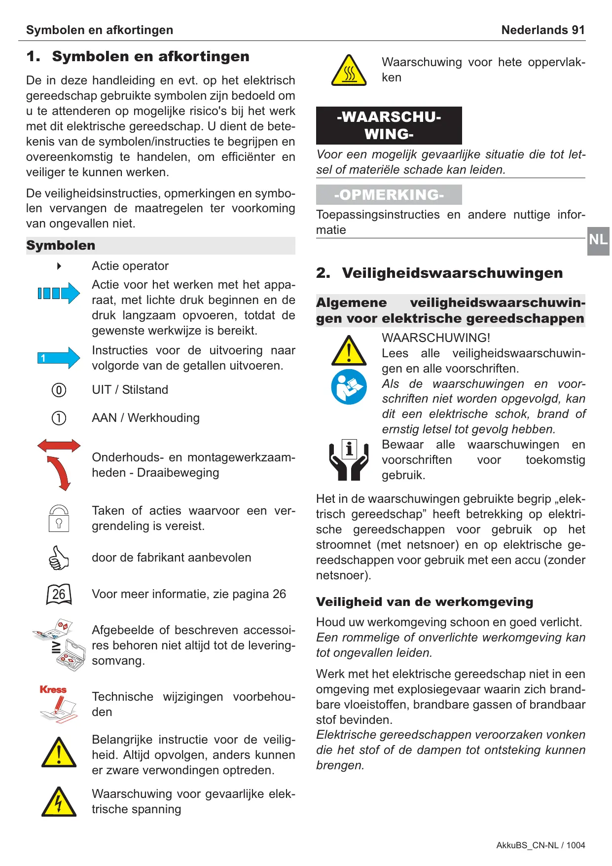het in het te bewerken werkstuk kantelt. Restrisico's. Hoewel de bedieningshandleidingen bij onze elektrische gereedschappen voorschriften met betrekking tot veilig werken met elektrische apparaten bevatten, brengt ieder elektrisch gereedschap bepaalde restrisico's met zich mee die ook door beschermingsvoorzieningen niet geheel uit te sluiten zijn. Bedien het gereedschap daarom altijd met de noodzakelijke voorzichtigheid! Veiligheidsvoorschriften m.b.t. de accu Gebruik geen defecte of vervormde accu's. Er bestaat explosiegevaar. Open de accu niet. Er bestaat gevaar voor kortsluiting. Sluit de accu nooit kort. Er bestaat explosiegevaar. Bescherm de accu tegen hitte, bijvoorbeeld ook tegen voortdurend zonlicht en vuur. Er bestaat explosiegevaar. Veiligheidswaarschuwingen Bij beschadiging en onjuist gebruik van de accu kunnen er dampen vrijkomen. Zorg voor frisse lucht en raadpleeg bij klachten een arts. De dampen kunnen de luchtwegen irriteren. Als de accu defect is, kan er vloeistof uit de accu lekken, waardoor aangrenzende voorwerpen worden bevochtigd. Controleer de betrokken onderdelen. Reinig deze of vervang ze indien nodig. De contacten van de accu bij het bewaren buiten het laadapparaat altijd afdekken. Bij kortsluiting door een metalen overbrugging bestaat brand- en explosiegevaar! Veiligheidsvoorschriften van het laadapparaat Gebruik het elektrische gereedschap niet als het snoer beschadigd is. Raak het beschadigde snoer niet aan en trek de stekker uit het stopcontact als het snoer tijdens de werkzaamheden beschadigd is. Beschadigde snoeren vergroten het risico op een elektrische schok. Nederlands 95 alleen door gekwalificeerd personeel en alleen met originele vervangingsonderdelen repareren. Beschadigde elektrische apparaten, kabels en stekkers vergroten het risico van een elektrische schok. -WAARSCHUWINGLaadapparaat niet openen! Let op: hoogspanning! Er bestaat gevaar voor een elektrische schok. Let erop, dat de verbinding van het laadapparaat en de accu correct is uitgevoerd en niet door vreemde voorwerpen wordt gehinderd. Bij kortsluiting door een metalen overbrugging bestaat brand- en explosiegevaar! Houd de laadschacht voor de accu vrij van vreemde voorwerpen, en bescherm deze tegen vuil en vocht. De opbergplaats moet droog en vorstvrij zijn. Bij kortsluiting bestaat brand- en explosiegevaar! Een op het stroomnet aangesloten laadapparaat altijd goed in de gaten houden. Er bestaat brandgevaar. Gebruik het elektrische apparaat niet op een gemakkelijk brandbare ondergrond (zoals papier of textiel) of in een brandbare omgeving. Vanwege de optredende verwarming bestaat brandgevaar. Houd het elektrische apparaat uit de buurt van regen en vocht. Het binnendringen van water in een oplaadapparaat vergroot het risico van een elektrische schok. Ventilatieklep van de acculader tijdens het laden niet afdekken. Op die manier vermijdt U een overhitting van ladetoestel en accu. Laad geen accu’s van andere fabrikanten op. Het elektrische apparaat is alleen geschikt voor het opladen van KRESS-accu’s. Anders bestaat brand- en explosiegevaar. Houd het elektrische apparaat schoon. Door vervuiling bestaat gevaar voor een elektrische schok. Controleer voor elk gebruik elektrisch apparaat, kabel en stekker. Gebruik het elektrische apparaat niet als u een beschadiging hebt vastgesteld. Open het elektrische apparaat niet zelf en laat het AkkuBS_CN-NL / 1004 96 Nederlands