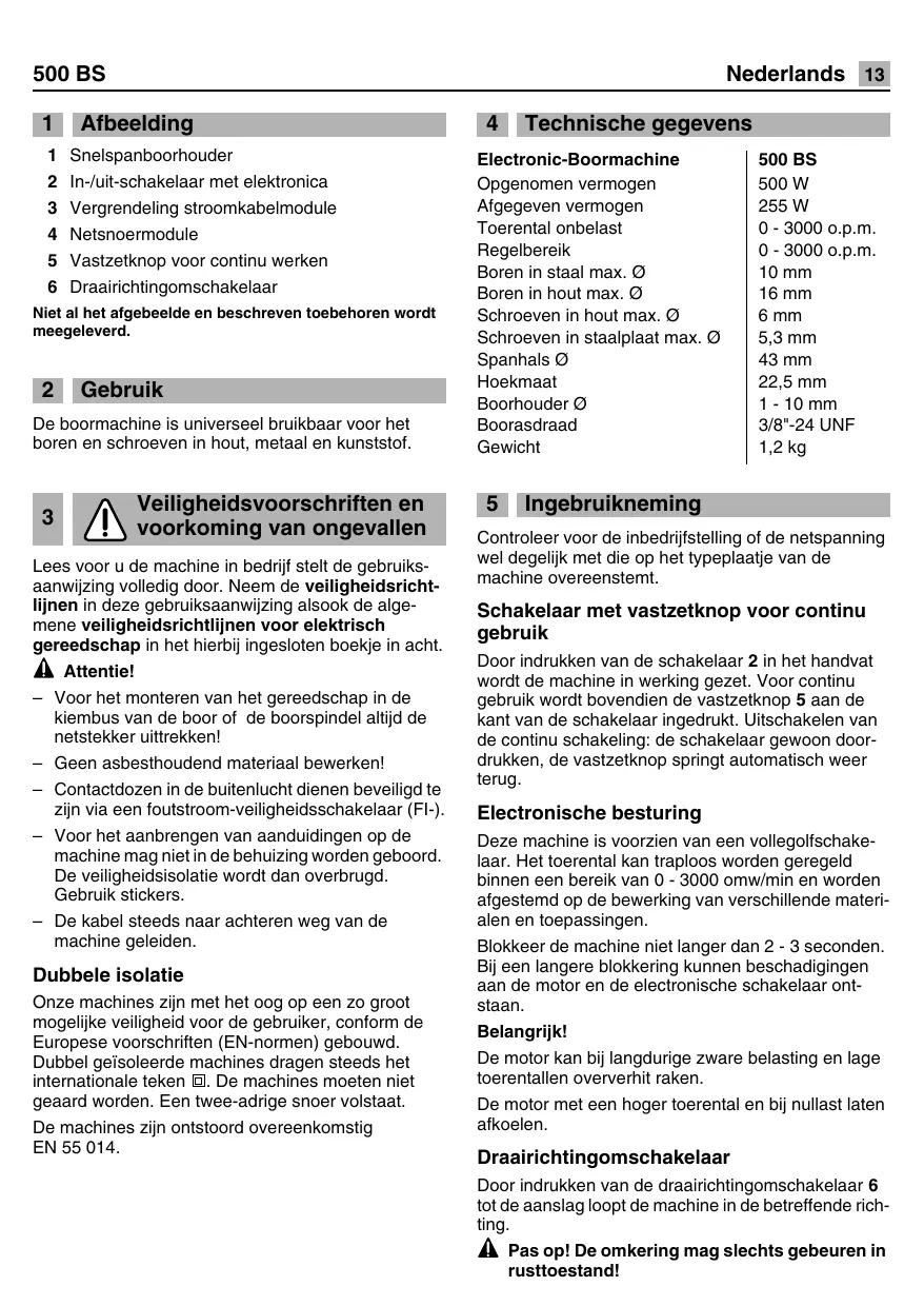 Electronic-Boormachine 500 BS Opgenomen vermogen 500 W Afgegeven vermogen 255 W Toerental onbelast 0- 3000 o.p.m. Regelbereik 0 - 3000 o.p.m. Boren in staal max. © 10 mm Boren in hout max. © 16 mm Schroeven in hout max. © 6 mm Schroeven in staalplaat max. © | 5,3mm Spanhals © 43 mm Hoekmaat 22,5 mm Boorhouder © 1-10 mm Boorasdraad 3/8"-24 UNF Gewicht 1,2Kg 5 Ingebruikneming Controleer voor de inbedrijfstelling of de netspanning wel degelik met die op het typeplaatje van de machine overeenstemt. Schakelaar met vastzetknop voor continu gebruik Door indrukken van de schakelaar 2 in het handvat wordt de machine in werking gezet. Voor continu gebruik wordt bovendien de vastzetknop 5 aan de Kant van de schakelaar ingedrukt. Uitschakelen van de continu schakeling: de schakelaar gewoon door- drukken, de vastzetknop springt automatisch weer terug. Electronische besturing Deze machine is voorzien van een vollegolfschake- laar. Het toerental kan traploos worden geregeld binnen een bereik van O - 3000 omw/min en worden afgestemd op de bewerking van verschillende materi- alen en toepassingen. Blokkeer de machine niet langer dan 2 - 3 seconden. Bij een langere blokkering kunnen beschadigingen aan de motor en de electronische schakelaar ont- staan. Belangrijk! De motor kan bij langdurige zware belasting en lage toerentallen oververhit raken. De motor met een hoger toerental en bij nullast laten afkoelen. Draairichtingomschakelaar Door indrukken van de draairichtingomschakelaar 6 tot de aanslag loopt de machine in de betreffende rich- ting. À Pas op! De omkering mag slechts gebeuren in rusttoestand!