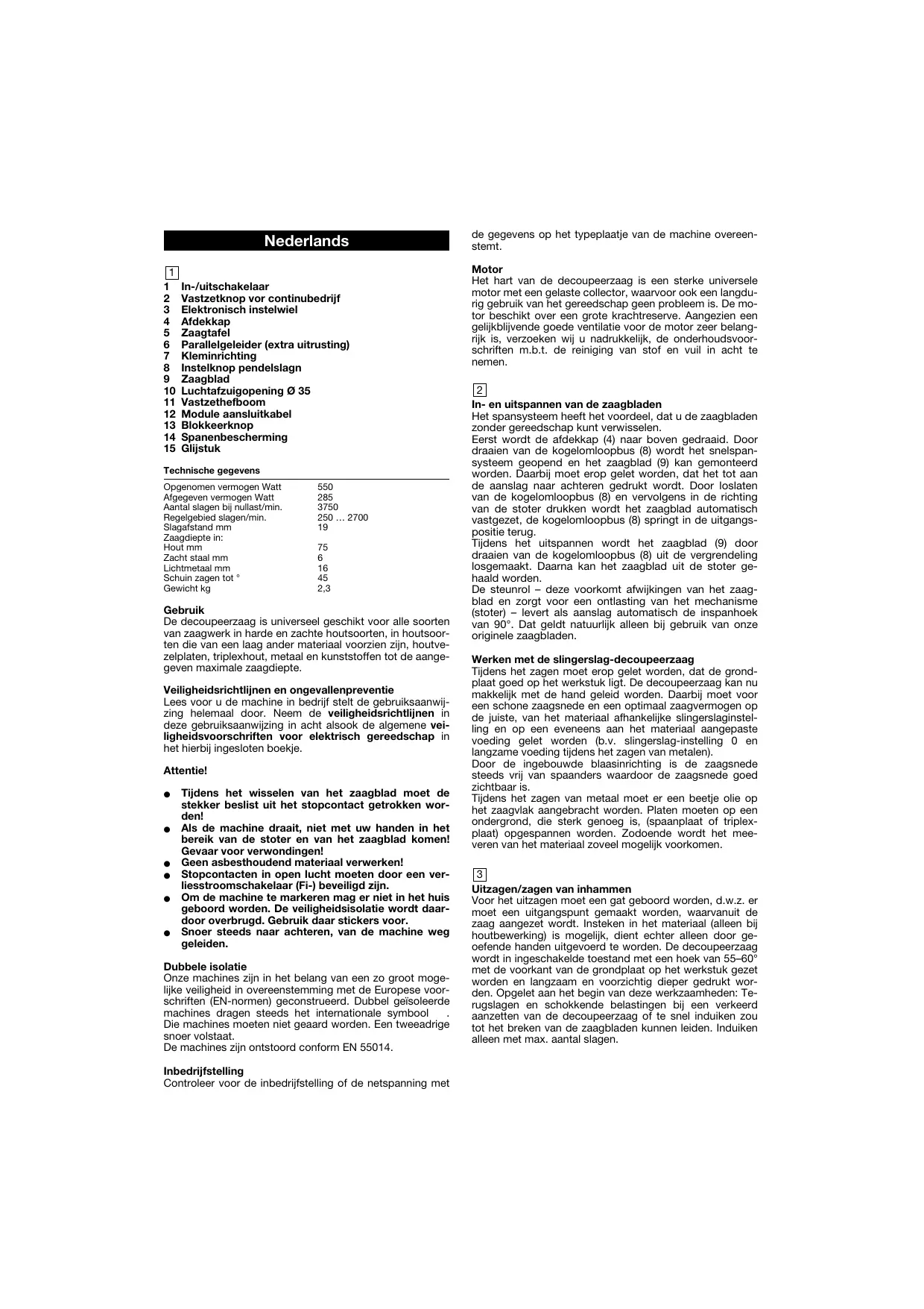 Tijdens het wisselen van het zaagblad moet de stekker beslist uit het stopcontact getrokken worden! Als de machine draait, niet met uw handen in het bereik van de stoter en van het zaagblad komen! Gevaar voor verwondingen! Geen asbesthoudend materiaal verwerken! Stopcontacten in open lucht moeten door een verliesstroomschakelaar (Fi-) beveiligd zijn. Om de machine te markeren mag er niet in het huis geboord worden. De veiligheidsisolatie wordt daardoor overbrugd. Gebruik daar stickers voor. Snoer steeds naar achteren, van de machine weg geleiden. Dubbele isolatie Onze machines zijn in het belang van een zo groot mogelijke veiligheid in overeenstemming met de Europese voorschriften (EN-normen) geconstrueerd. Dubbel geïsoleerde machines dragen steeds het internationale symbool Die machines moeten niet geaard worden. Een tweeadrige snoer volstaat. De machines zijn ontstoord conform EN 55014. Inbedrijfstelling Controleer voor de inbedrijfstelling of de netspanning met de gegevens op het typeplaatje van de machine overeenstemt. Motor Het hart van de decoupeerzaag is een sterke universele motor met een gelaste collector, waarvoor ook een langdurig gebruik van het gereedschap geen probleem is. De motor beschikt over een grote krachtreserve. Aangezien een gelijkblijvende goede ventilatie voor de motor zeer belangrijk is, verzoeken wij u nadrukkelijk, de onderhoudsvoorschriften m.b.t. de reiniging van stof en vuil in acht te nemen. In- en uitspannen van de zaagbladen Het spansysteem heeft het voordeel, dat u de zaagbladen zonder gereedschap kunt verwisselen. Eerst wordt de afdekkap (4) naar boven gedraaid. Door draaien van de kogelomloopbus (8) wordt het snelspansysteem geopend en het zaagblad (9) kan gemonteerd worden. Daarbij moet erop gelet worden, dat het tot aan de aanslag naar achteren gedrukt wordt. Door loslaten van de kogelomloopbus (8) en vervolgens in de richting van de stoter drukken wordt het zaagblad automatisch vastgezet, de kogelomloopbus (8) springt in de uitgangspositie terug. Tijdens het uitspannen wordt het zaagblad (9) door draaien van de kogelomloopbus (8) uit de vergrendeling losgemaakt. Daarna kan het zaagblad uit de stoter gehaald worden. De steunrol – deze voorkomt afwijkingen van het zaagblad en zorgt voor een ontlasting van het mechanisme (stoter) – levert als aanslag automatisch de inspanhoek van 90°. Dat geldt natuurlijk alleen bij gebruik van onze originele zaagbladen. Werken met de slingerslag-decoupeerzaag Tijdens het zagen moet erop gelet worden, dat de grondplaat goed op het werkstuk ligt. De decoupeerzaag kan nu makkelijk met de hand geleid worden. Daarbij moet voor een schone zaagsnede en een optimaal zaagvermogen op de juiste, van het materiaal afhankelijke slingerslaginstelling en op een eveneens aan het materiaal aangepaste voeding gelet worden (b.v. slingerslag-instelling 0 en langzame voeding tijdens het zagen van metalen). Door de ingebouwde blaasinrichting is de zaagsnede steeds vrij van spaanders waardoor de zaagsnede goed zichtbaar is. Tijdens het zagen van metaal moet er een beetje olie op het zaagvlak aangebracht worden. Platen moeten op een ondergrond, die sterk genoeg is, (spaanplaat of triplexplaat) opgespannen worden. Zodoende wordt het meeveren van het materiaal zoveel mogelijk voorkomen. Uitzagen/zagen van inhammen Voor het uitzagen moet een gat geboord worden, d.w.z. er moet een uitgangspunt gemaakt worden, waarvanuit de zaag aangezet wordt. Insteken in het materiaal (alleen bij houtbewerking) is mogelijk, dient echter alleen door geoefende handen uitgevoerd te worden. De decoupeerzaag wordt in ingeschakelde toestand met een hoek van 55–60° met de voorkant van de grondplaat op het werkstuk gezet worden en langzaam en voorzichtig dieper gedrukt worden. Opgelet aan het begin van deze werkzaamheden: Terugslagen en schokkende belastingen bij een verkeerd aanzetten van de decoupeerzaag of te snel induiken zou tot het breken van de zaagbladen kunnen leiden. Induiken alleen met max. aantal slagen.