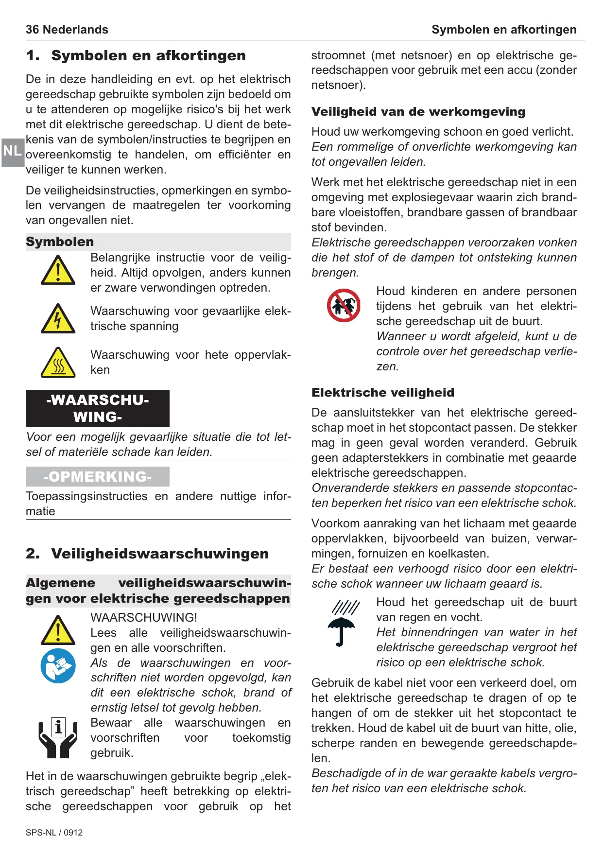De in deze handleiding en evt. op het elektrisch gereedschap gebruikte symbolen zijn bedoeld om u te attenderen op mogelijke risico's bij het werk met dit elektrische gereedschap. U dient de betekenis van de symbolen/instructies te begrijpen en NL overeenkomstig te handelen, om efficiënter en veiliger te kunnen werken. De veiligheidsinstructies, opmerkingen en symbolen vervangen de maatregelen ter voorkoming van ongevallen niet. Symbolen Belangrijke instructie voor de veiligheid. Altijd opvolgen, anders kunnen er zware verwondingen optreden. Waarschuwing voor gevaarlijke elektrische spanning Waarschuwing voor hete oppervlakken -WAARSCHUWINGVoor een mogelijk gevaarlijke situatie die tot letsel of materiële schade kan leiden. -OPMERKINGToepassingsinstructies en andere nuttige informatie