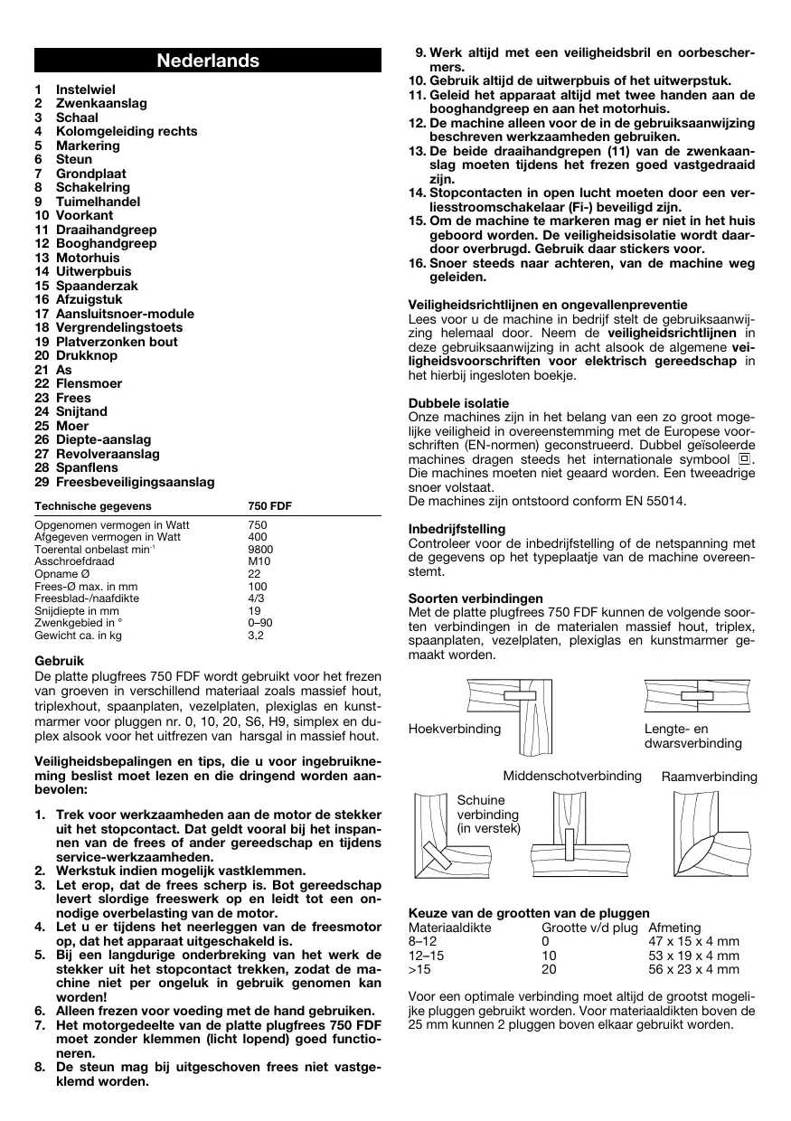 Dubbele isolatie Onze machines zijn in het belang van een zo groot mogelijke veiligheid in overeenstemming met de Europese voorschriften (EN-normen) geconstrueerd. Dubbel geïsoleerde machines dragen steeds het internationale symbool Die machines moeten niet geaard worden. Een tweeadrige snoer volstaat. De machines zijn ontstoord conform EN 55014. Inbedrijfstelling Controleer voor de inbedrijfstelling of de netspanning met de gegevens op het typeplaatje van de machine overeenstemt. Soorten verbindingen Met de platte plugfrees 750 FDF kunnen de volgende soorten verbindingen in de materialen massief hout, triplex, spaanplaten, vezelplaten, plexiglas en kunstmarmer gemaakt worden. Hoekverbinding Lengte- en dwarsverbinding Middenschotverbinding Raamverbinding Schuine verbinding (in verstek) Keuze van de grootten van de pluggen Materiaaldikte Grootte v/d plug Afmeting 8–12 47 x 15 x 4 mm 12–15 53 x 19 x 4 mm >15 56 x 23 x 4 mm Voor een optimale verbinding moet altijd de grootst mogelijke pluggen gebruikt worden. Voor materiaaldikten boven de 25 mm kunnen 2 pluggen boven elkaar gebruikt worden.