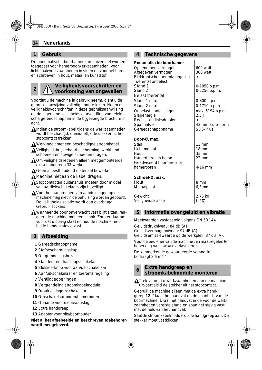 Technische gegevens Pneumatische boorhamer Opgenomen vermogen Afgegeven vermogen Elektronische toerentalregeling Toerental onbelast Stand 1 Stand 2 Stand 1 max. Stand 2 max. Onbelast aantal slagen Slagenergie Rechts- en linksdraaien Spanhals-ø Gereedschapopname Boor-Ø, max. Staal Licht metaal Hout Hamerboren in beton Geadviseerd boorbereik bij hamerboren Schroef-Ø, max. Stopcontacten buitenshuis moeten door middel van aardlekschakelaars zijn beveiligd. Voor het aanbrengen van aanduidingen op de machine mag niet in de behuizing worden geboord. De veiligheidsisolatie wordt dan overbrugd. Gebruik stickers. Wanneer de boor onverwacht vast blijft zitten, reageert de machine met een schok. Zorg er daarom voor dat u stevig staat en hou de machine met beide handen stevig vast. Hout 1 Gereedschapopname 2 Stofbeschermingskap 3 Ontgrendelingshuls 4 Standen- en draaistopschakelaar 5 Blokkeerknop voor aan/uit-schakelaar 6 Aan/uit-schakelaar en toerentalregeling 7 Ventilatieopeningen 8 Vergrendeling stroomkabelmodule 9 Draairichtingomschakelaar 10 Omschakelaar boren/hamerboren 11 Opname voor diepteaanslag 12 Extra handgreep 13 Adapter voor bits/boorhouder Niet al het afgebeelde en beschreven toebehoren wordt meegeleverd.