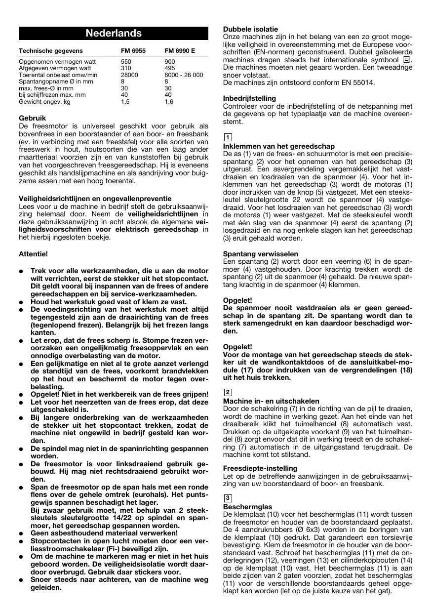 1,6 Gebruik De freesmotor is universeel geschikt voor gebruik als bovenfrees in een boorstaander of een boor- en freesbank (ev. in verbinding met een freestafel) voor alle soorten van freeswerk in hout, houtsoorten die van een laag ander maartteriaal voorzien zijn en van kunststoffen bij gebruik van het voorgeschreven freesgereedschap. Hij is eveneens geschikt als handslijpmachine en als aandrijving voor buigzame assen met een hoog toerental. Veiligheidsrichtlijnen en ongevallenpreventie Lees voor u de machine in bedrijf stelt de gebruiksaanwijzing helemaal door. Neem de veiligheidsrichtlijnen in deze gebruiksaanwijzing in acht alsook de algemene veiligheidsvoorschriften voor elektrisch gereedschap in het hierbij ingesloten boekje. Attentie!