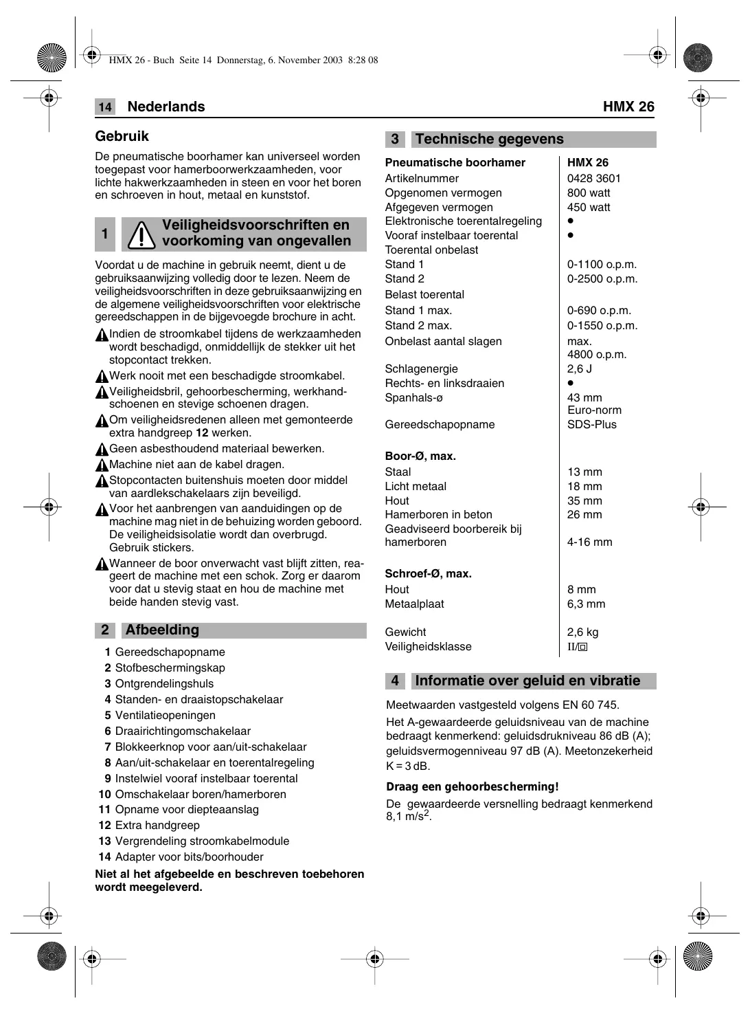 2 Afbeelding 1 Gereedschapopname 2 Stofbeschermingskap 3 Ontgrendelingshuls 4 Standen- en draaistopschakelaar 5 Ventilatieopeningen 6 Draairichtingomschakelaar 7 Blokkeerknop voor aan/uit-schakelaar 8 Aan/uit-schakelaar en toerentalregeling 9 Instelwiel vooraf instelbaar toerental 10 Omschakelaar boren/hamerboren 11 Opname voor diepteaanslag 12 Extra handgreep 13 Vergrendeling stroomkabelmodule 14 Adapter voor bits/boorhouder Niet al het afgebeelde en beschreven toebehoren wordt meegeleverd. 3 Technische gegevens Pneumatische boorhamer HMX 26 Artikelnummer 0428 3601 Opgenomen vermogen 800 watt Afgegeven vermogen 450 watt Elektronische toerentalregeling | + Vooraf instelbaar toerental . Toerental onbelast Stand 1 0-1100 op.m. Stand 2 0-2500 o.p.m. Belast toerental Stand 1 max. 0-690 o.p.m. Stand 2 max. 0-1550 o.p.m. Onbelast aantal slagen max. 4800 o.p.m. Schlagenergie 26J Rechts- en linksdraaien . Spanhals-o 43 mm Euro-norm Gereedschapopname SDS-Plus Boor-9, max. Staal 13 mm Licht metaal 18 mm Hout 35 mm Hamerboren in beton 26 mm Geadviseerd boorbereik bij hamerboren 4-16 mm Schroef-D, max. Hout 8 mm Metaalplaat 6,3 mm Gewicht 2,6 kg Veiligheidsklasse [el