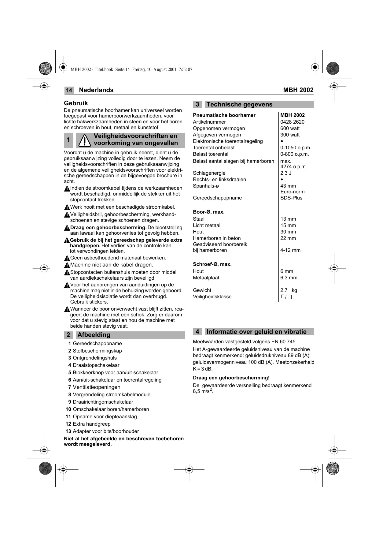 Informatie over geluid en vibratie Meetwaarden vastgesteld volgens EN 60 745. Het A-gewaardeerde geluidsniveau van de machine bedraagt kenmerkend: geluidsdrukniveau 89 dB (A); geluidsvermogenniveau 100 dB (A). Meetonzekerheid K = 3 dB. Draag een gehoorbescherming! De gewaardeerde versnelling bedraagt kenmerkend 8,5 m/s2. MBH 2002 - Titel.book Seite 15 Freitag, 10. August 2001 7:52 07 MBH 2002