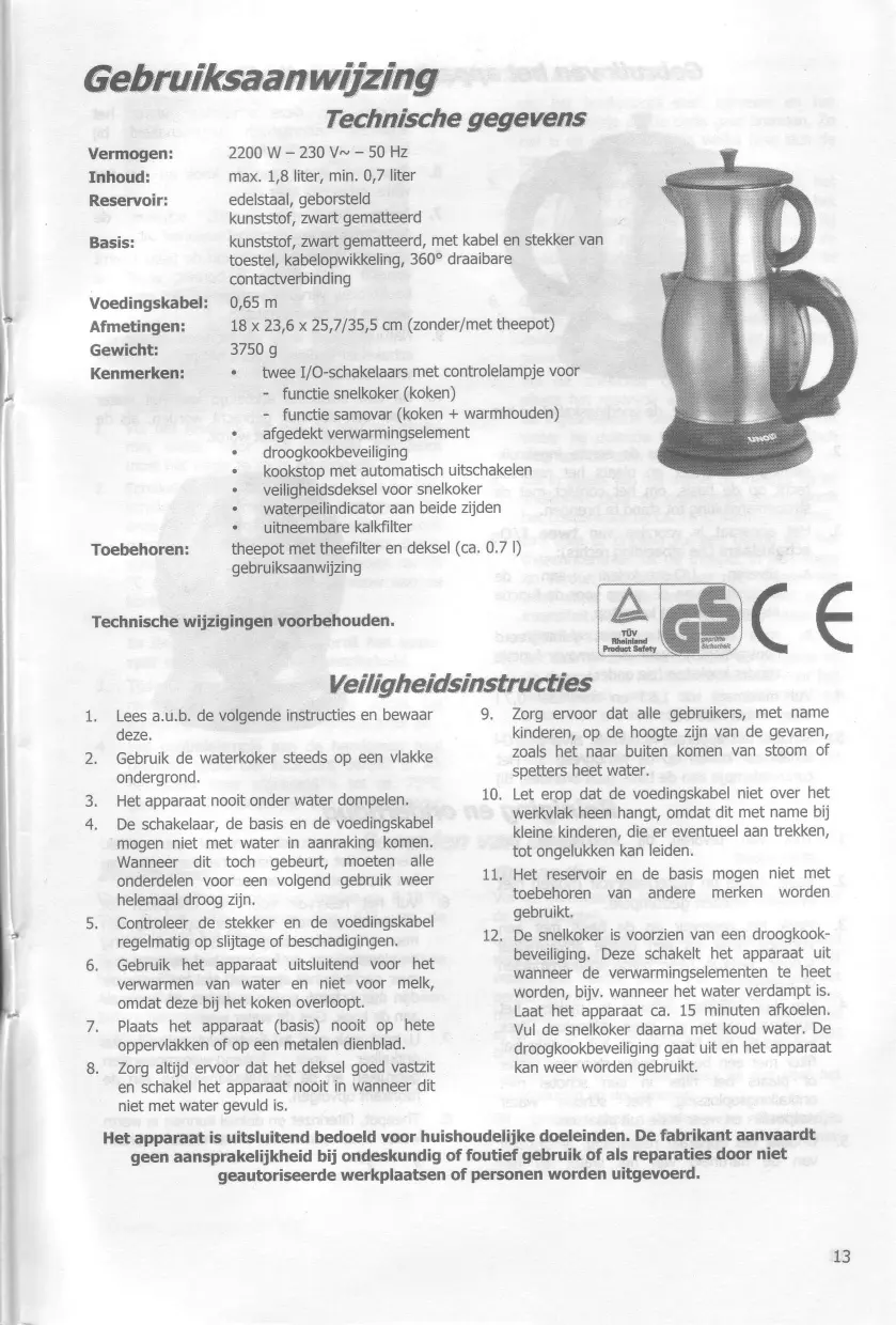 11. Ne jamäis utiliserun röcipientou un socle d'uneautremaroue. 12. Le bouilloireexpresest 6quipdd'unes6curitd de chauffesans liquidequi l€teint lorsque l'eau s'est 6vapor6e. Laissez l'appareil refroidirDendant environ15 min.Remolissezle ensuited'eaufroide.Las6curit6de chauffe et sans liquide s€teint automatiouement prötä fonctionner. l'appareil estä nouveau Läpparcil est pr6vue pour l'utilisation dans les menages. Le manufacteurd€clinetoute rcsponsabilit6en cas d'usageinapprcprid ou inconecte ou aprts que des r6parationsont 6t6 faites par des tiers.