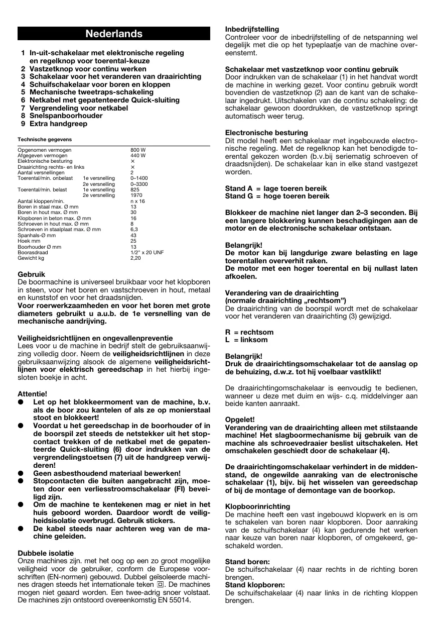 1/2" x 20 UNF 2,20 Gebruik De boormachine is universeel bruikbaar voor het klopboren in steen, voor het boren en vastschroeven in hout, metaal en kunststof en voor het draadsnijden. Voor roerwerkzaamheden en voor het boren met grote diameters gebruikt u a.u.b. de 1e versnelling van de mechanische aandrijving. Veiligheidsrichtlijnen en ongevallenpreventie Lees voor u de machine in bedrijf stelt de gebruiksaanwijzing volledig door. Neem de veiligheidsrichtlijnen in deze gebruiksaanwijzing alsook de algemene veiligheidsrichtlijnen voor elektrisch gereedschap in het hierbij ingesloten boekje in acht. Attentie! ● Let op het blokkeermoment van de machine, b.v. als de boor zou kantelen of als ze op monierstaal stoot en blokkeert! ● Voordat u het gereedschap in de boorhouder of in de boorspil zet steeds de netstekker uit het stopcontact trekken of de netkabel met de gepatenteerde Quick-sluiting (6) door indrukken van de vergrendelingstoetsen (7) uit de handgreep verwijderen! ● Geen asbesthoudend materiaal bewerken! ● Stopcontacten die buiten aangebracht zijn, moeten door een verliesstroomschakelaar (FI) beveiligd zijn. ● Om de machine te kentekenen mag er niet in het huis geboord worden. Daardoor wordt de veiligheidsisolatie overbrugd. Gebruik stickers. ● De kabel steeds naar achteren weg van de machine geleiden. Dubbele isolatie Onze machines zijn. met het oog op een zo groot mogelijke veiligheid voor de gebruiker, conform de Europese voorschriften (EN-normen) gebouwd. Dubbel geïsoleerde machines dragen steeds het internationale teken . De machines mogen niet geaard worden. Een twee-adrig snoer volstaat. De machines zijn ontstoord overeenkomstig EN 55014. Inbedrijfstelling Controleer voor de inbedrijfstelling of de netspanning wel degelijk met die op het typeplaatje van de machine overeenstemt. Schakelaar met vastzetknop voor continu gebruik Door indrukken van de schakelaar (1) in het handvat wordt de machine in werking gezet. Voor continu gebruik wordt bovendien de vastzetknop (2) aan de kant van de schakelaar ingedrukt. Uitschakelen van de continu schakeling: de schakelaar gewoon doordrukken, de vastzetknop springt automatisch weer terug. Electronische besturing Dit model heeft een schakelaar met ingebouwde electronische regeling. Met de regelknop kan het benodigde toerental gekozen worden (b.v.bij seriematig schroeven of draadsnijden). De schakelaar kan in elke stand vastgezet worden. Stand A = lage toeren bereik Stand G = hoge toeren bereik Blokkeer de machine niet langer dan 2–3 seconden. Bij een langere blokkering kunnen beschadigingen aan de motor en de electronische schakelaar ontstaan. Belangrijk! De motor kan bij langdurige zware belasting en lage toerentallen oververhit raken. De motor met een hoger toerental en bij nullast laten afkoelen. Verandering van de draairichting (normale draairichting „rechtsom”) De draairichting van de boorspil wordt met de schakelaar voor het veranderen van draairichting (3) gewijzigd. R = rechtsom L = linksom Belangrijk! Druk de draairichtingsomschakelaar tot de aanslag op de behuizing, d.w.z. tot hij voelbaar vastklikt! De draairichtingomschakelaar is eenvoudig te bedienen, wanneer u deze met duim en wijs- c.q. middelvinger aan beide kanten aanraakt. Opgelet! Verandering van de draairichting alleen met stilstaande machine! Het slagboormechanisme bij gebruik van de machine als schroevedraaier beslist uitschakelen. Het omschakelen geschiedt door de schakelaar (4). De draairichtingomschakelaar verhindert in de middenstand, de ongewilde aanraking van de electronische schakelaar (1), bijv. bij het wisselen van gereedschap of bij de montage of demontage van de boorkop. Klopboorinrichting De machine heeft een vast ingebouwd klopwerk en is om te schakelen van boren naar klopboren. Door aanraking van de schuifschakelaar (4) kan gedurende het werken naar keuze van boren naar klopboren, of omgekeerd, geschakeld worden. Stand boren: De schuifschakelaar (4) naar rechts in de richting boren brengen. Stand klopboren: De schuifschakelaar (4) naar links in de richting kloppen brengen. Mechanische tweetrapsschakeling. De omschakeling geschiedt door draaien van de draaihendel (5). Stand 1 = machine draait langzaam Stand 2 = machine draait snel De schakeling met twee snelheden levert voordelen bij het boren en klopboren met kleine boordiameters tot ca. 8 mm. Aandrijving = schakelstand 2. Voor grotere diameters en voor roerwerkzaamheden. Aandrijving = schakelstand 1. Veiligheidskoppeling De slipkoppeling treedt in werking zodra het in de machine ingespannen werkgereedschap overbelast of klem geraakt of stootsgewijs afgeremd wordt. Motor en drijfwerk lopen verder maar het werkgereedschap blijft staan. De motor en het drijfwerk zijn tegen overbelasting beschermd. Stootsgewijze belasting van de tandwielen is uitgesloten. Boorhouder De boorhouder is vastgezet met een draaimoment van 30 Nm. Alleen zo is verzekerd dat een linksdraaiende boorhouder niet per ongeluk van de boorspil loopt. Bij vervanging van de boorhouder dient de nieuwe boorhouder, voordat de machine weer in gebruik wordt genomen, ten minste met een draaimoment van 30 Nm vastgezet te worden. Voor het monteren van een nieuwe boorhouder dienen de langsvlakken op de boorhouder en de boorspil gereinigd te worden. Attentie! Vóór het demonteren en opnieuw monteren van de boorhouder steeds de netstekker uit het stopcontact trekken of de netkabel (6) door indrukken van de vergrendelingstoetsen (7) uit de handgreep verwijderen! Attentie! Het is niet volledig uit te sluiten dat de klembus zich in de linksloop van de boorspil lost. Controleer dan ook regelmatig tijdens het werk of de klembus nog stevig op de boorspil zit. Bediening van de snelspanboorhouder Deze boorhouder is speciaal voor klopboormachines ontwikkeld. De volautomatische boorspilvergrendeling maakt het mogelijk snel en probleemloos het gereedschap in de boorhouder te wisselen. Bij bediening van de boorhouder wordt de spil automatisch vergr
