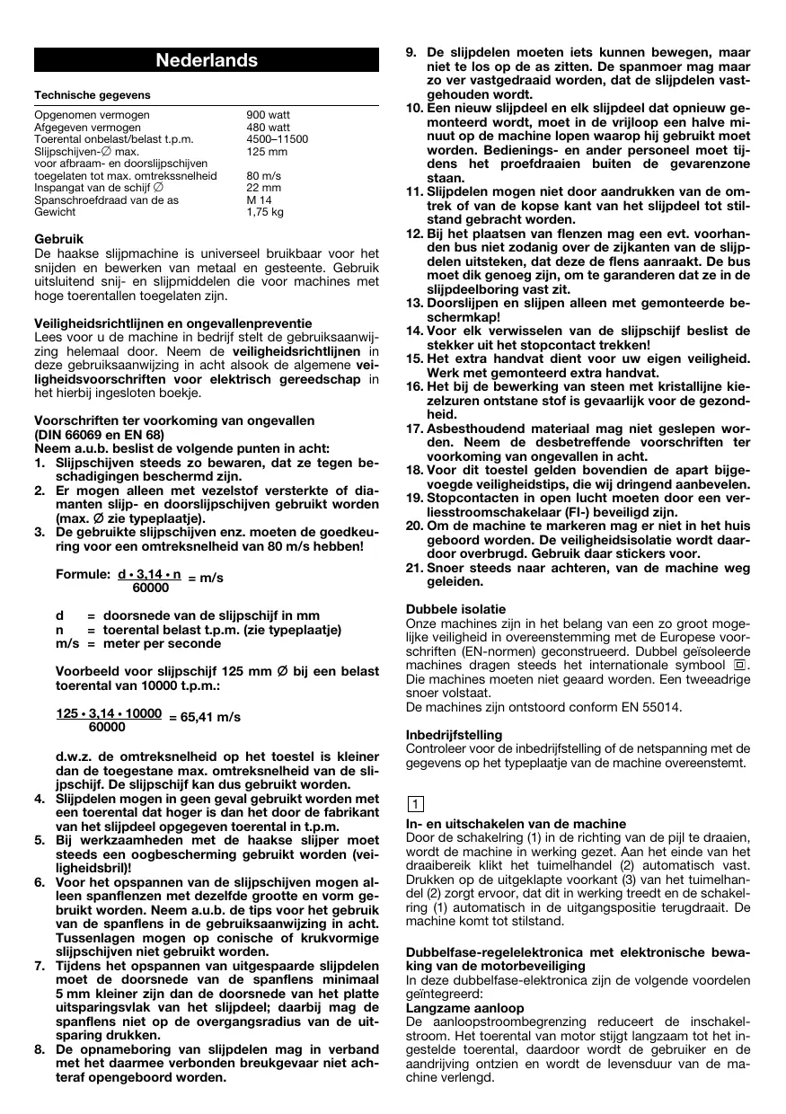 = doorsnede van de slijpschijf in mm = toerental belast t.p.m. (zie typeplaatje) m/s = meter per seconde Voorbeeld voor slijpschijf 125 mm bij een belast toerental van 10000 t.p.m.: 125 3,14 10000 = 65,41 m/s