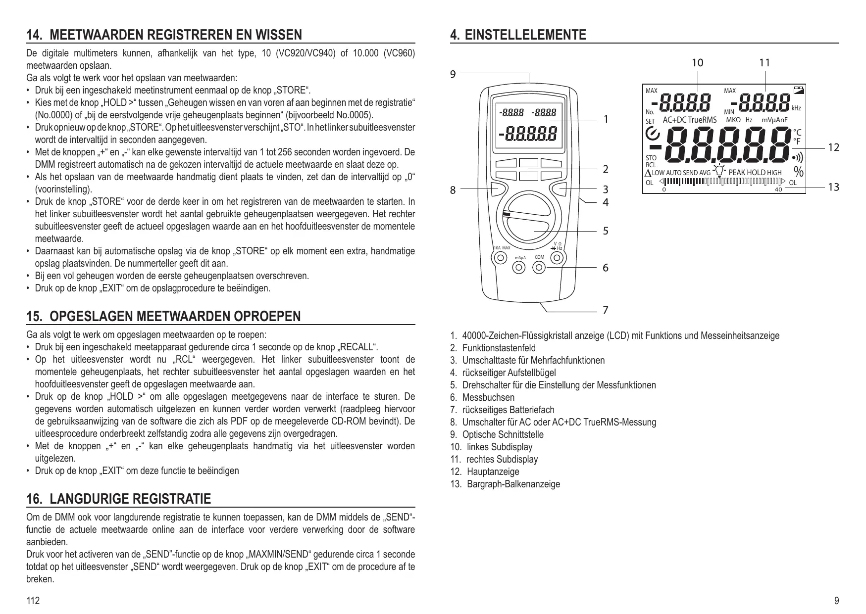 - „STORE/RECALL“ maakt het opslaan en weergeven van verschillende meetwaarden mogelijk (VC920 en VC-940 10 meetwaarden/ VC960 10.000 meetwaarden)