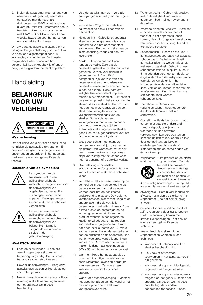Nederlands Beperkte garantie Geachte cliënt, Welkom bij B&W. Dit product is volgens de hoogste kwaliteitsnormen ontworpen en vervaardigd. Mocht er toch iets defect zijn aan dit product dan kunt u aanspraak maken op gratis vervanging van onderdelen via de nationale distributeur van B&W Loudspeakers (er zijn uitzonderingen) in elk land waar een officiële B&W distributeur gevestigd is. Deze beperkte garantie is geldig voor een periode van vijf jaar vanaf de aankoopdatum en twee jaar voor de elektronica, waaronder actieve luidsprekers.