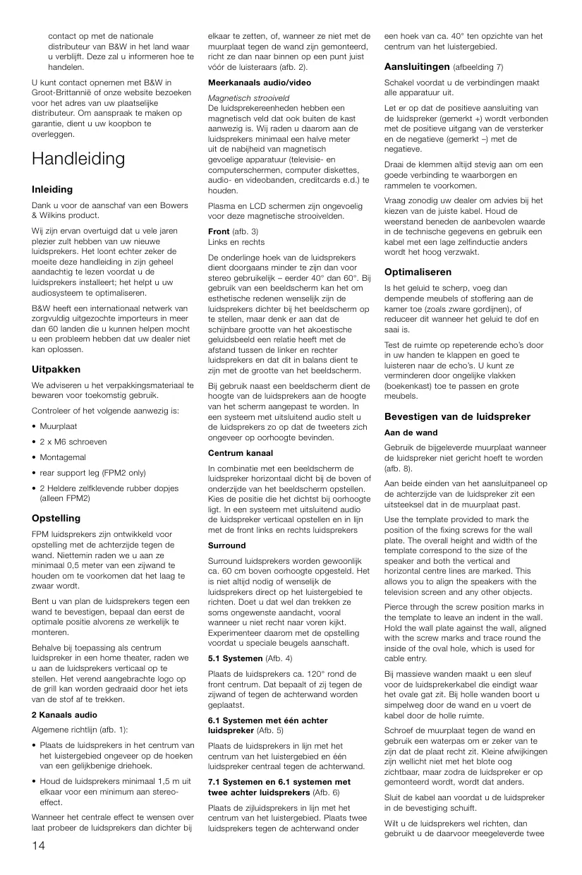 contact op met de nationale distributeur van B&W in het land waar u verblijft. Deze zal u informeren hoe te handelen. U kunt contact opnemen met B&W in Groot-Brittannië of onze website bezoeken voor het adres van uw plaatselijke distributeur. Om aanspraak te maken op garantie, dient u uw koopbon te overleggen. elkaar te zetten, of, wanneer ze niet met de muurplaat tegen de wand zijn gemonteerd, richt ze dan naar binnen op een punt juist vóór de luisteraars (afb. 2). een hoek van ca. 40° ten opzichte van het centrum van het luistergebied. Meerkanaals audio/video Schakel voordat u de verbindingen maakt alle apparatuur uit. Inleiding Magnetisch strooiveld De luidsprekereenheden hebben een magnetisch veld dat ook buiten de kast aanwezig is. Wij raden u daarom aan de luidsprekers minimaal een halve meter uit de nabijheid van magnetisch gevoelige apparatuur (televisie- en computerschermen, computer diskettes, audio- en videobanden, creditcards e.d.) te houden. Dank u voor de aanschaf van een Bowers & Wilkins product. Plasma en LCD schermen zijn ongevoelig voor deze magnetische strooivelden. Wij zijn ervan overtuigd dat u vele jaren plezier zult hebben van uw nieuwe luidsprekers. Het loont echter zeker de moeite deze handleiding in zijn geheel aandachtig te lezen voordat u de luidsprekers installeert; het helpt u uw audiosysteem te optimaliseren. Front (afb. 3) Links en rechts Handleiding B&W heeft een internationaal netwerk van zorgvuldig uitgezochte importeurs in meer dan 60 landen die u kunnen helpen mocht u een probleem hebben dat uw dealer niet kan oplossen. Uitpakken We adviseren u het verpakkingsmateriaal te bewaren voor toekomstig gebruik. Controleer of het volgende aanwezig is: