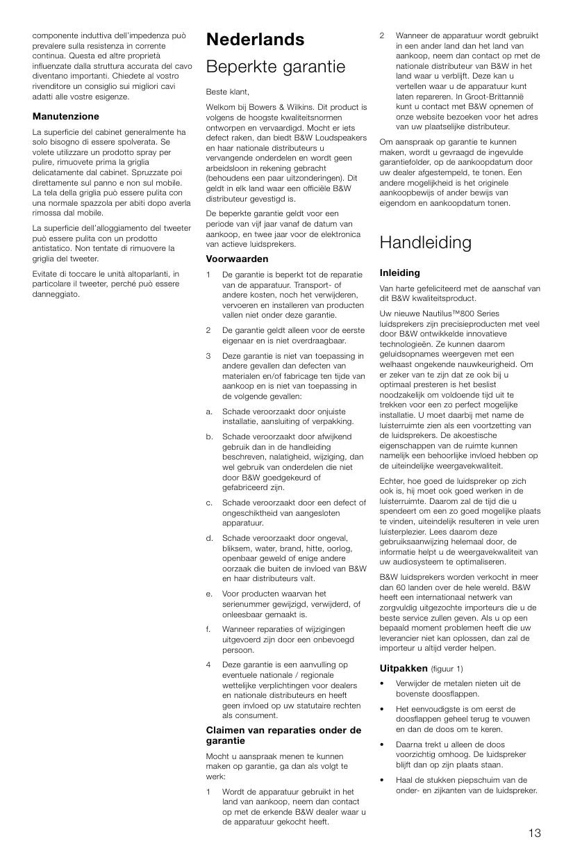 Inleiding Van harte gefeliciteerd met de aanschaf van dit B&W kwaliteitsproduct. Uw nieuwe Nautilus™800 Series luidsprekers zijn precisieproducten met veel door B&W ontwikkelde innovatieve technologieën. Ze kunnen daarom geluidsopnames weergeven met een welhaast ongekende nauwkeurigheid. Om er zeker van te zijn dat ze ook bij u optimaal presteren is het beslist noodzakelijk om voldoende tijd uit te trekken voor een zo perfect mogelijke installatie. U moet daarbij met name de luisterruimte zien als een voortzetting van de luidsprekers. De akoestische eigenschappen van de ruimte kunnen namelijk een behoorlijke invloed hebben op de uiteindelijke weergavekwaliteit. Echter, hoe goed de luidspreker op zich ook is, hij moet ook goed werken in de luisterruimte. Daarom zal de tijd die u spendeert om een zo goed mogelijke plaats te vinden, uiteindelijk resulteren in vele uren luisterplezier. Lees daarom deze gebruiksaanwijzing helemaal door, de informatie helpt u de weergavekwaliteit van uw audiosysteem te optimaliseren. B&W luidsprekers worden verkocht in meer dan 60 landen over de hele wereld. B&W heeft een internationaal netwerk van zorgvuldig uitgezochte importeurs die u de beste service zullen geven. Als u op een bepaald moment problemen heeft die uw leverancier niet kan oplossen, dan zal de importeur u altijd verder helpen.
