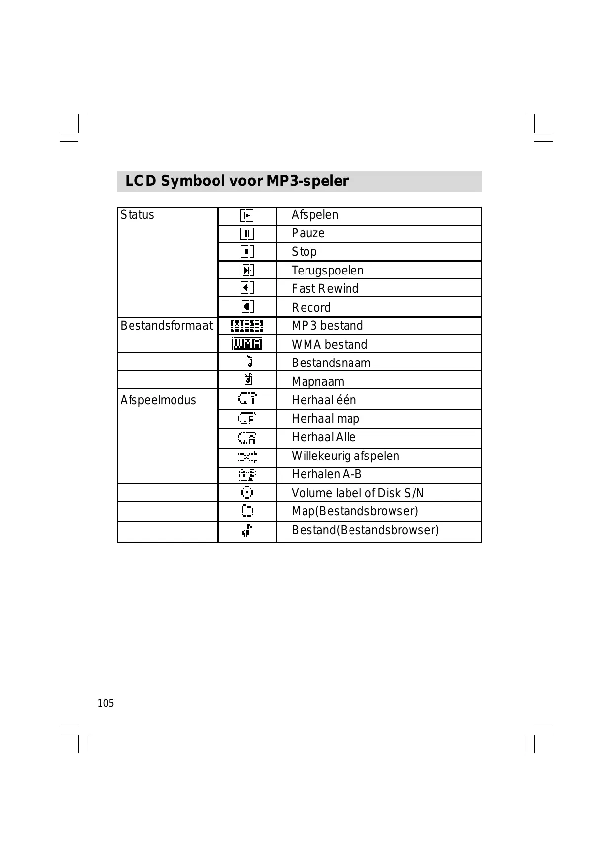 Afspelen Pauze Stop Terugspoelen Fast Rewind Record MP3 bestand WMA bestand Bestandsnaam Mapnaam Herhaal één Herhaal map Herhaal Alle Willekeurig afspelen Herhalen A-B Volume label of Disk S/N Map(Bestandsbrowser) Bestand(Bestandsbrowser) Gebruik van Alkaline Batterijen