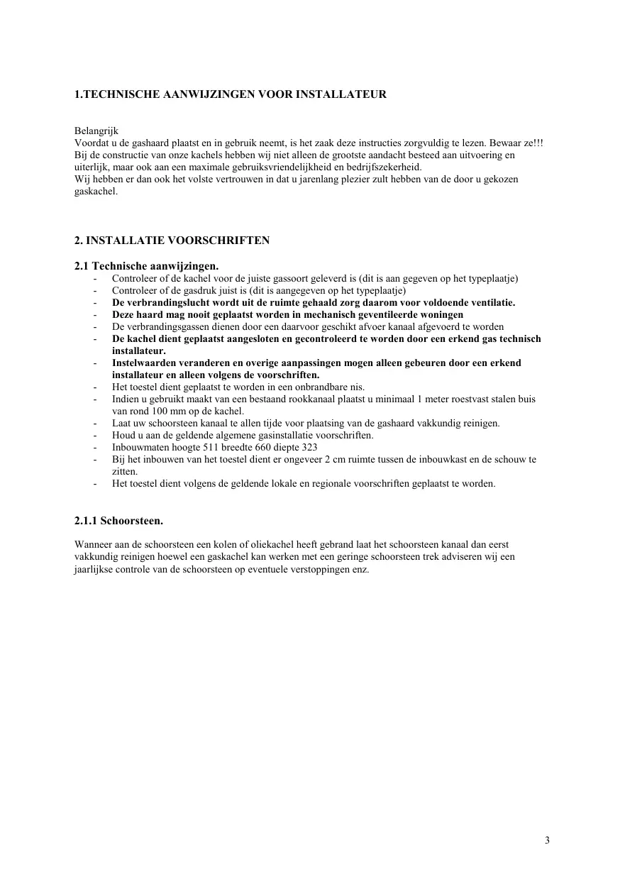 Controleer of de kachel voor de juiste gassoort geleverd is (dit is aan gegeven op het typeplaatje) Controleer of de gasdruk juist is (dit is aangegeven op het typeplaatje) De verbrandingslucht wordt uit de ruimte gehaald zorg daarom voor voldoende ventilatie. Deze haard mag nooit geplaatst worden in mechanisch geventileerde woningen De verbrandingsgassen dienen door een daarvoor geschikt afvoer kanaal afgevoerd te worden De kachel dient geplaatst aangesloten en gecontroleerd te worden door een erkend gas technisch installateur. Instelwaarden veranderen en overige aanpassingen mogen alleen gebeuren door een erkend installateur en alleen volgens de voorschriften. Het toestel dient geplaatst te worden in een onbrandbare nis. Indien u gebruikt maakt van een bestaand rookkanaal plaatst u minimaal 1 meter roestvast stalen buis van rond 100 mm op de kachel. Laat uw schoorsteen kanaal te allen tijde voor plaatsing van de gashaard vakkundig reinigen. Houd u aan de geldende algemene gasinstallatie voorschriften. Inbouwmaten hoogte 511 breedte 660 diepte 323 Bij het inbouwen van het toestel dient er ongeveer 2 cm ruimte tussen de inbouwkast en de schouw te zitten. Het toestel dient volgens de geldende lokale en regionale voorschriften geplaatst te worden.