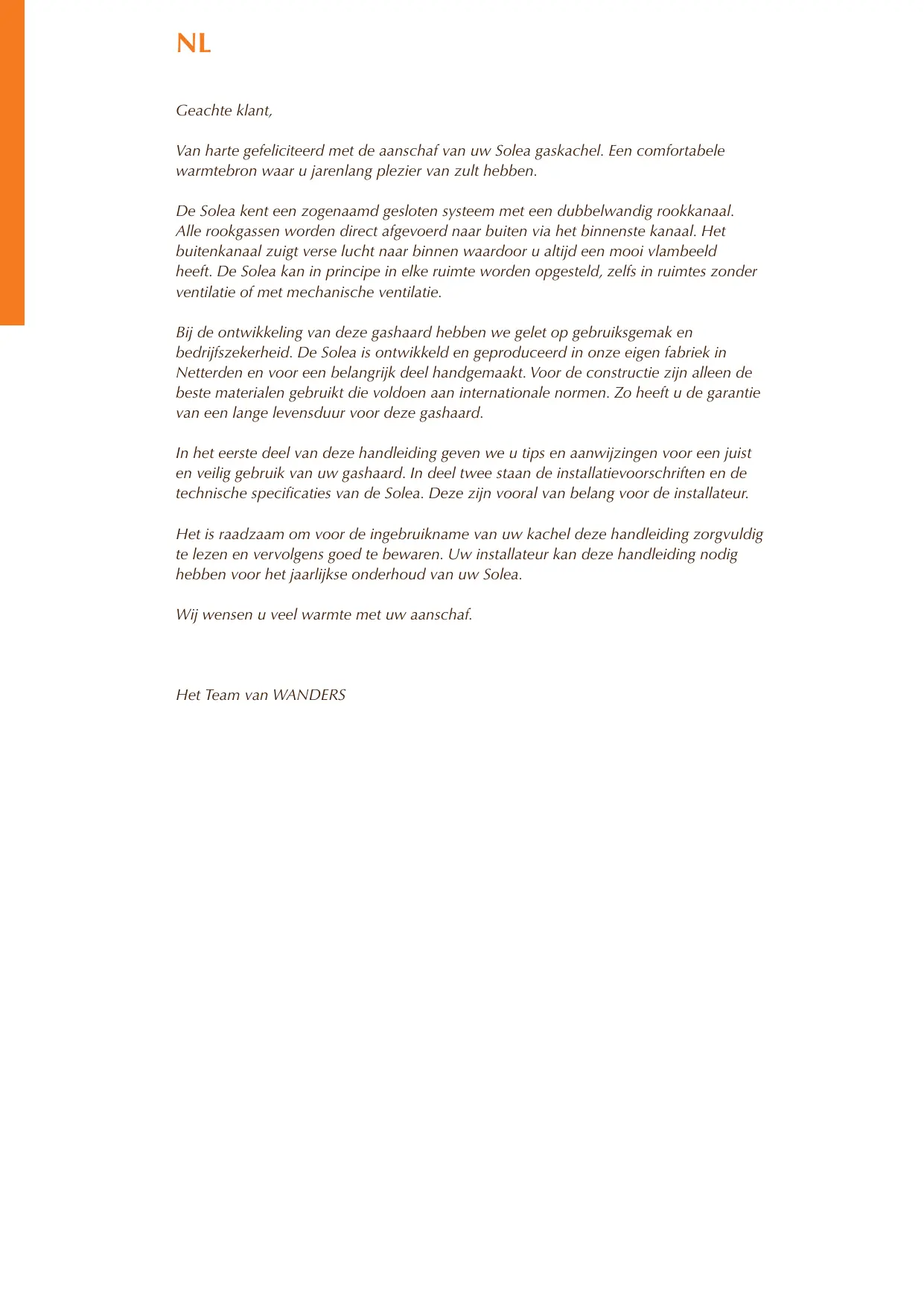 In het eerste deel van deze handleiding geen we u tips en aanwijzingen voor een juist en veilig gebruik van uw gashaard. In deel twee staan de installmentievoorschriften en de technische specificaties van de Solea. Deze zijn vooral van belang voor de installerateur.