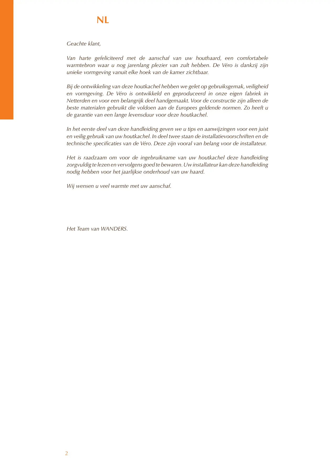 5. Haal de voet uit de doos. 6. Monteer de voet, met de 4 schroeven weer terug vast. 7. Til de haard nu rechtop. (Denk aan uw rug) 8. Zet de haard op zijn plaats, zorg ervoor dat de haard precies midden onder het afvoergat staat. 9. monteer nu uw rookgasafvoer. De rookgasafvoer dient afwaterend gemonteerd te worden • Vervang de glasruit • Controleer of het glasband nog heel en vast op de deur zit. Zo niet plak deze opnieuw vast of vervang deze geheel. • Vervang het glas Par son design unique est visible de tous les coins de la pièce. Ce poêle à bois a été conçu tout spécialement pour répondre aux exigences d’un emploi aisé, de la sécurité et du design. Votre poêle est développé et produit dans notre usine à Netterden (Pays-Bas) et fait à la main pour une partie importante. La construction est faite uniquement en les meilleurs matériaux en conformité avec les normes européennes en vigueur. Vous bénéficierez ainsi de la garantie d’une longue durée de vie pour ce poêle. La première partie de ce mode d’emploi est consacrée aux conseils pour une utilisation correcte de votre poêle à bois en toute sécurité. La deuxième partie comporte les instructions d’installation et les caractéristiques techniques destinées notamment à l’installateur. Nous vous recommandons de lire ce manuel attentivement avant la mise en service de votre poêle à bois et de bien le conserver. Votre installateur en aura besoin pour l’entretien annuel de votre poêle. Nous espérons que vous profiterez beaucoup de l’ambiance chaleureuse du Véro.