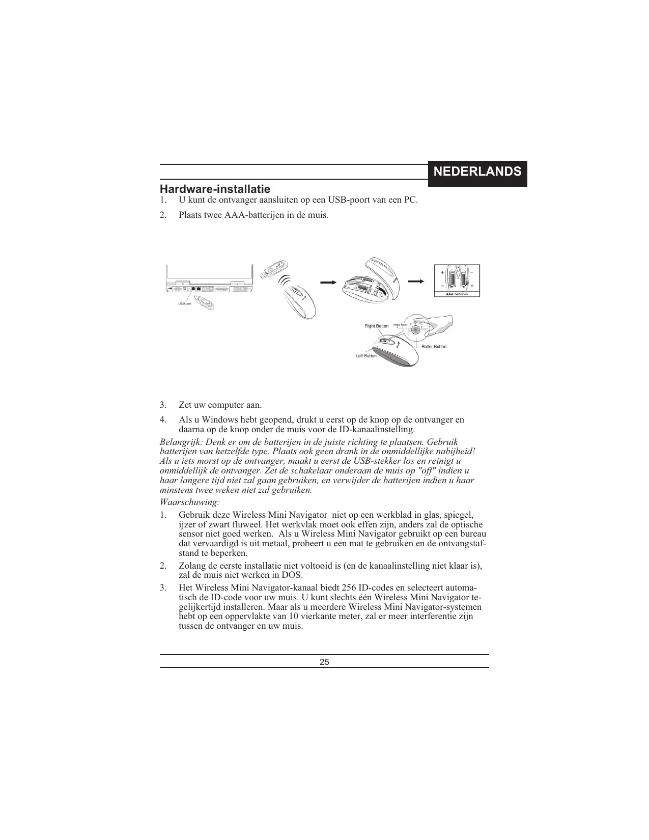 zal de muis niet werken in DOS. 3. Het Wireless Mini Navigator-kanaal biedt 256 ID-codes en selecteert automatisch de ID-code voor uw muis. U kunt slechts één Wireless Mini Navigator tegelijkertijd installeren. Maar als u meerdere Wireless Mini Navigator-systemen hebt op een oppervlakte van 10 vierkante meter, zal er meer interferentie zijn tussen de ontvanger en uw muis.
