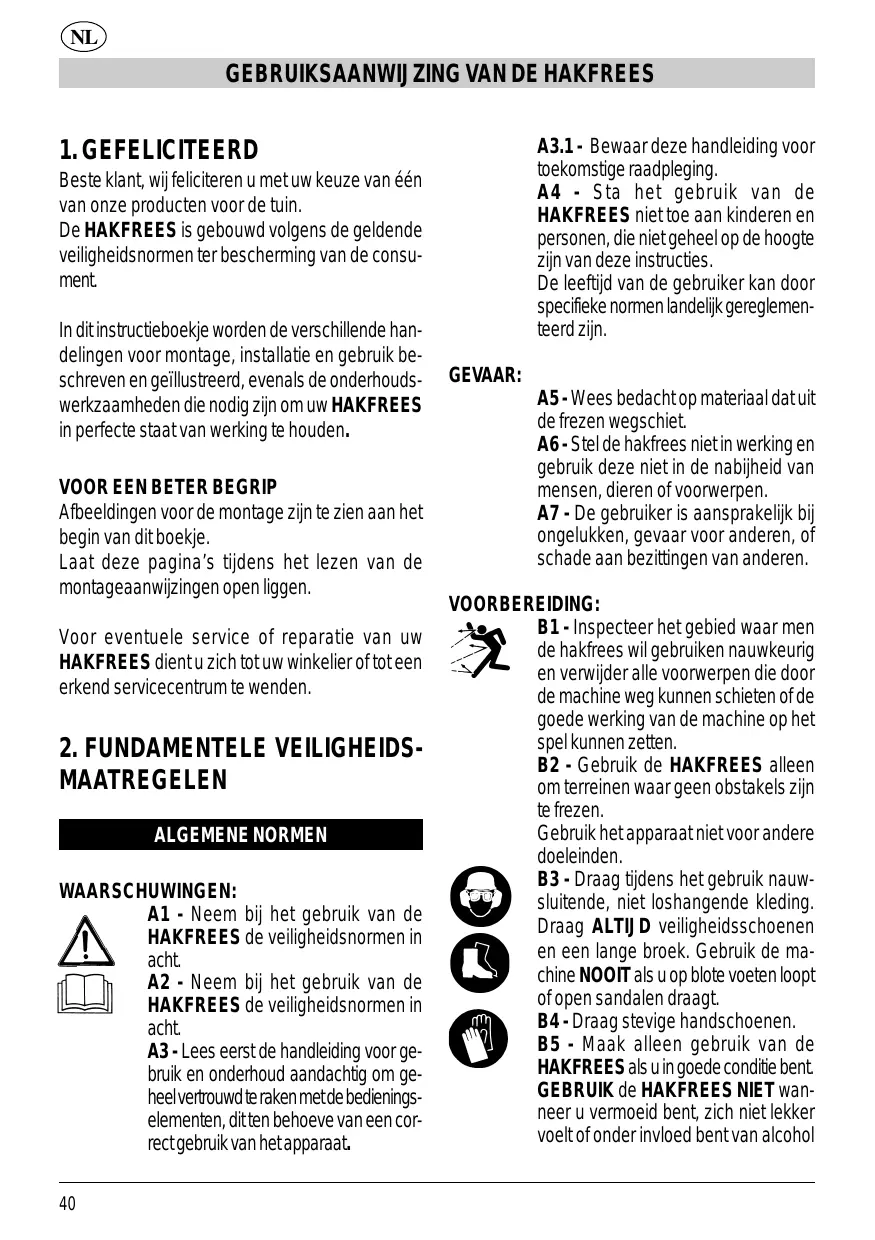 2. FUNDAMENTELE VEILIGHEIDSMAATREGELEN ALGEMENE NORMEN WAARSCHUWINGEN: A1 - Neem bij het gebruik van de HAKFREES de veiligheidsnormen in acht. A2 - Neem bij het gebruik van de HAKFREES de veiligheidsnormen in acht. A3 - Lees eerst de handleiding voor gebruik en onderhoud aandachtig om geheel vertrouwd te raken met de bedieningselementen, dit ten behoeve van een correct gebruik van het apparaat. 40