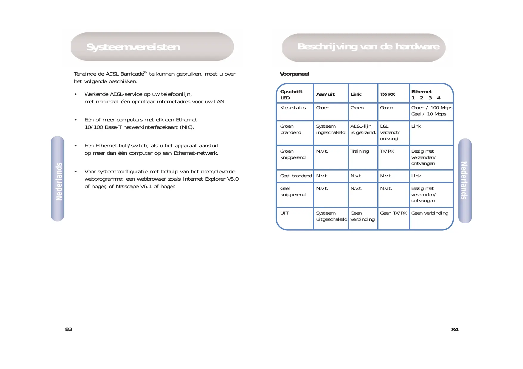 Voor systeemconfiguratie met behulp van het meegeleverde webprogramma: een webbrowser zoals Internet Explorer V5.0 of hoger, of Netscape V6.1 of hoger. Link Training TX/RX Bezig met verzenden/ ontvangen Geel brandend N.v.t. N.v.t. N.v.t. Link Geel knipperend N.v.t. N.v.t. N.v.t. Bezig met verzenden/ ontvangen UIT Geen Systeem uitgeschakeld verbinding Nederlands Nederlands