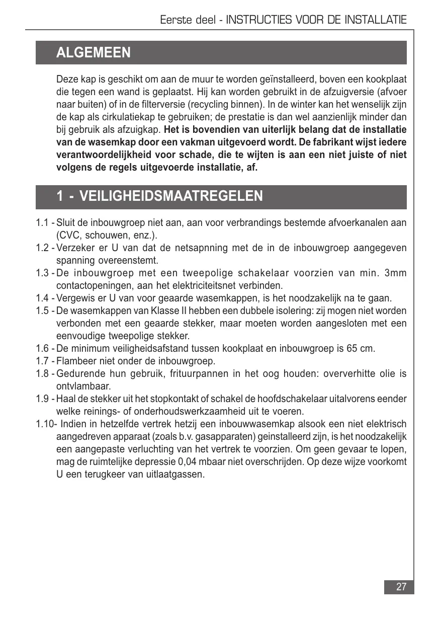 welke reinings- of onderhoudswerkzaamheid uit te voeren. 1.10- Indien in hetzelfde vertrek hetzij een inbouwwasemkap alsook een niet elektrisch aangedreven apparaat (zoals b.v. gasapparaten) geinstalleerd zijn, is het noodzakelijk een aangepaste verluchting van het vertrek te voorzien. Om geen gevaar te lopen, mag de ruimtelijke depressie 0,04 mbaar niet overschrijden. Op deze wijze voorkomt U een terugkeer van uitlaatgassen.
