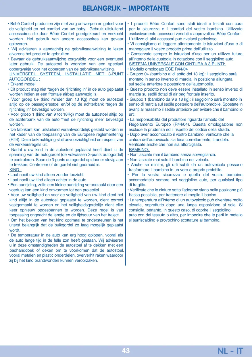 NL - IT BELANGRIJK – IMPORTANTE OVERIGE INSTRUCTIES : • Deze autostoel voor kinderen is uitsluitend doeltreffend indien de gebruiksinstructies gerespecteerd worden. • Maak de autostoel altijd vast in uw auto, zelfs als er geen kind in geplaatst is. • De gebruiker dient ervoor te zorgen dat bagage en andere objecten die verwondingen aan het kind zouden kunnen veroorzaken goed en stevig in de auto geplaatst worden. • Plaats nooit zware voorwerpen op de hoedenplank om projectie bij een aanrijding te voorkomen. • Bij het installeren van de autostoel in het voertuig dient men er op te letten dat harde elementen en plastic delen van de autostoel zodanig geplaatst worden dat deze niet geklemd worden tussen een autoportier of onder een beweegbare passagierstoel of autobank. • Controleer steeds opnieuw dat er geen enkel deel van de autostoel of veiligheidsgordeltje geklemd wordt onder de autostoel of tussen de autoportier. • Na een ongeval dient de autostoel vervangen te worden. • Verander nooit de constructie of materialen van de autostoel en het veiligheidsgordeltje. • Gebruik nooit de autostoel zonder bekleding. Vervang nooit de bekleding door een andere dan voor dit type autostoel geschikte autostoelbekleding. Men mag uitsluitend de door de fabrikant aanbevolen autostoelbekleding gebruiken. • Achterbanken met neerklapbare rugleuningen dienen altijd goed vergrendeld te zijn. • Plaats na aankoop de stoel in uw auto. Indien u problemen ondervindt betreft de lengte van de autogordel, neem dan contact op met uw autoverdeler. • Indien er twijfel bestaat over installatie/plaatsing of gebruik van de autostoel adviseren wij de consument contact op te nemen met de babyspeciaalzaak of fabrikant. De veiligheid van kinderen in de auto is essentieel. Een autostoel, draagwieg of babyschelp moet veilig zijn en mag geen enkele fout bezitten. Een autostoel geplaatst in de positie “met de rijrichting mee” of geplaatst in de positie “tegen de rijrichting in” moet het lichaam van het kind perfect ondersteunen. Een autostoel moet comfortabel voor het kind zijn en moet voor de ouders eenvoudig te bedienen zijn. Bébé Confort is sinds zijn bestaan bezorgd om baby’s veiligheid. Bébé Confort ontwerpt uitsluitend autostoelen die perfect aan baby’s lichaamsbouw zijn aangepast en autostoelen die in overeenstemming zijn met de wettelijke normen en meest recente Europese reglementeringen.